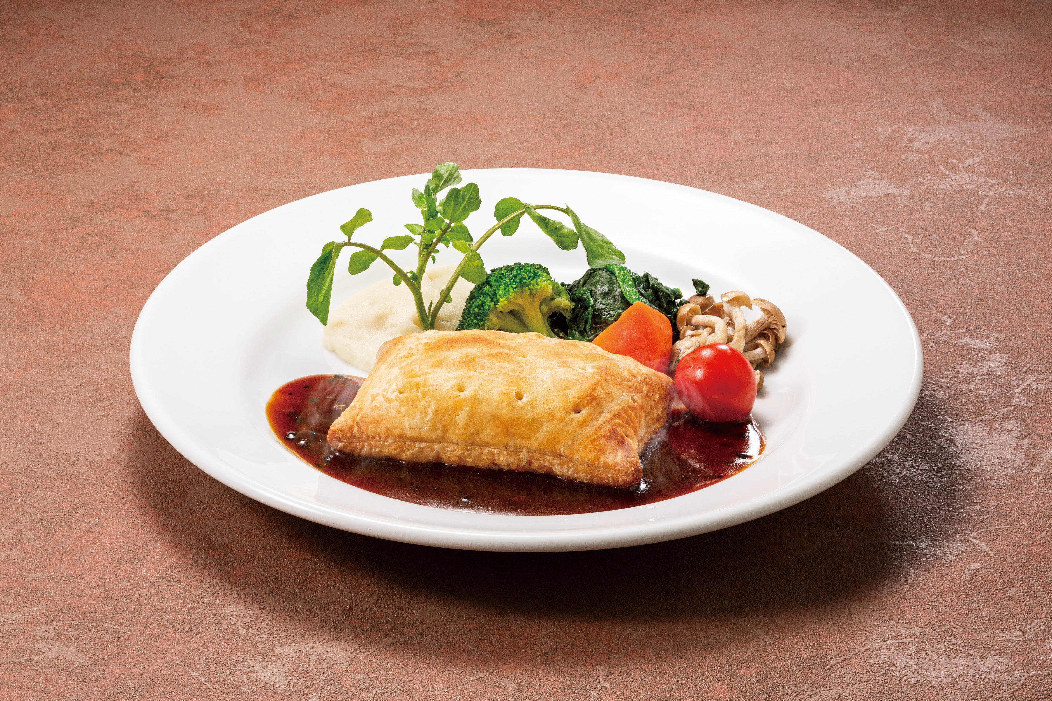 ジューシーな牛ひき肉をパイに包み、オーブンで焼き上げました。サクサクのパイとジューシーなお肉は相性抜群です。トリュフソースでリッチな気分に。