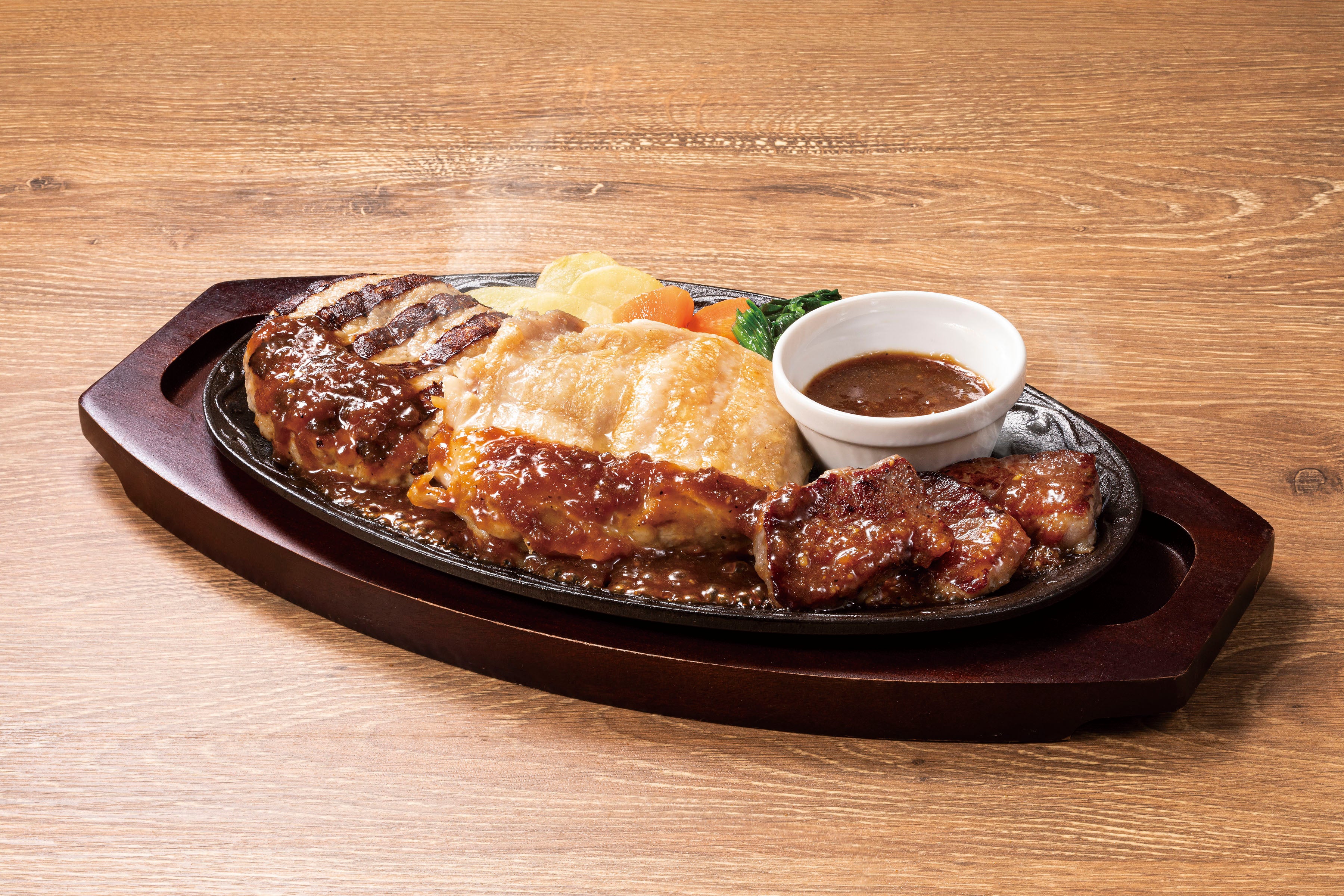 しっかり食べたい!にお応えするメニューとして人気のメニュー「GRILLブラザーズ」が、年末年始には、お得なセット対象の商品となります。ハンバーグ、チキン、ステーキと3種類のグリルを鉄板に乗せてボリューム満点のメニューです。