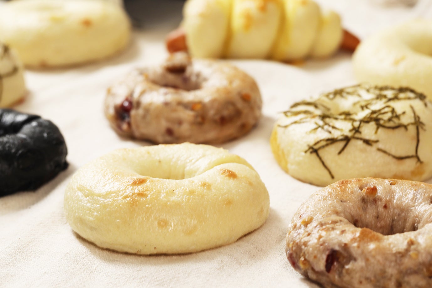 プレーン、ソシソン、ショコラ、豚まん、小倉&きな粉、クランベリーとクルミ、明太子、チーズ、イチゴとクリームチーズなど、種類はさまざま。お惣菜系からスイーツ系のフレーバーを取り揃えているため、その日の気分でお好きなフレーバーをお選びいただいたり、食べ比べていただくのもおすすめです。