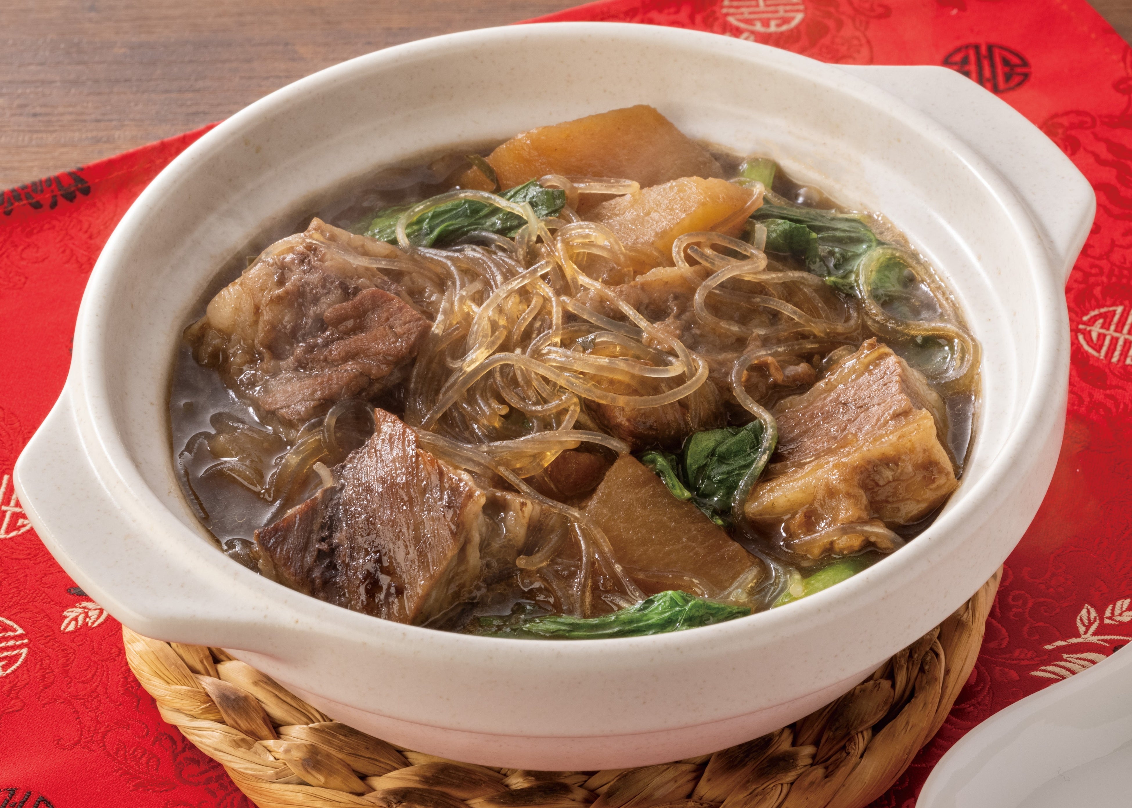 五香粉(ウーシャンフェン)のスープで牛バラ肉をやわらかくなるまで煮込み、旨味が染み込んだ春雨が入った台湾夜市の名物グルメ「土鍋煮」。提供後もコンロで加熱し、最後まで熱々でお楽しみいただけます。