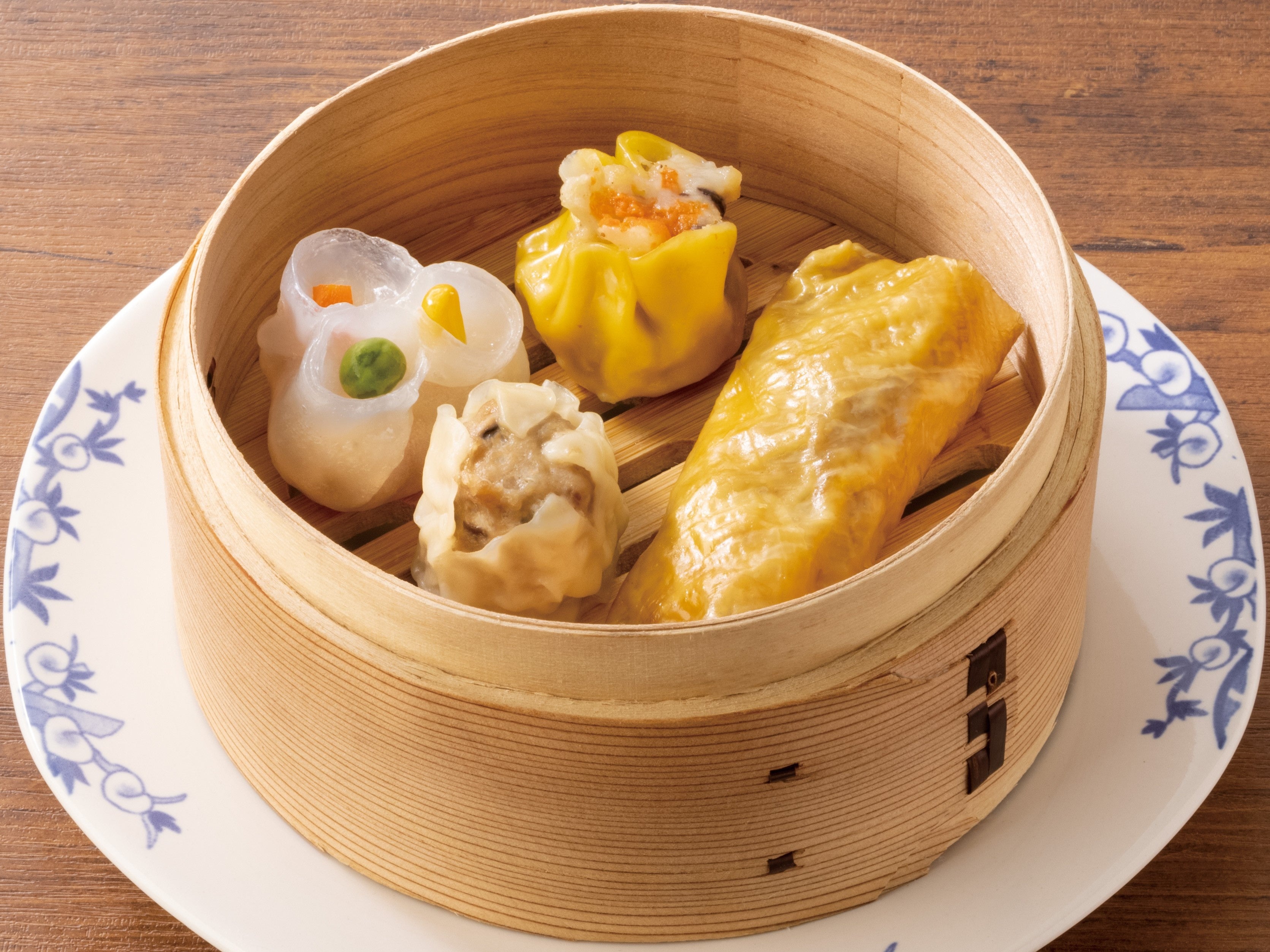 ●海鮮焼売:黄色と赤の彩りよい海鮮の点心。やわらかな食感が特徴です。