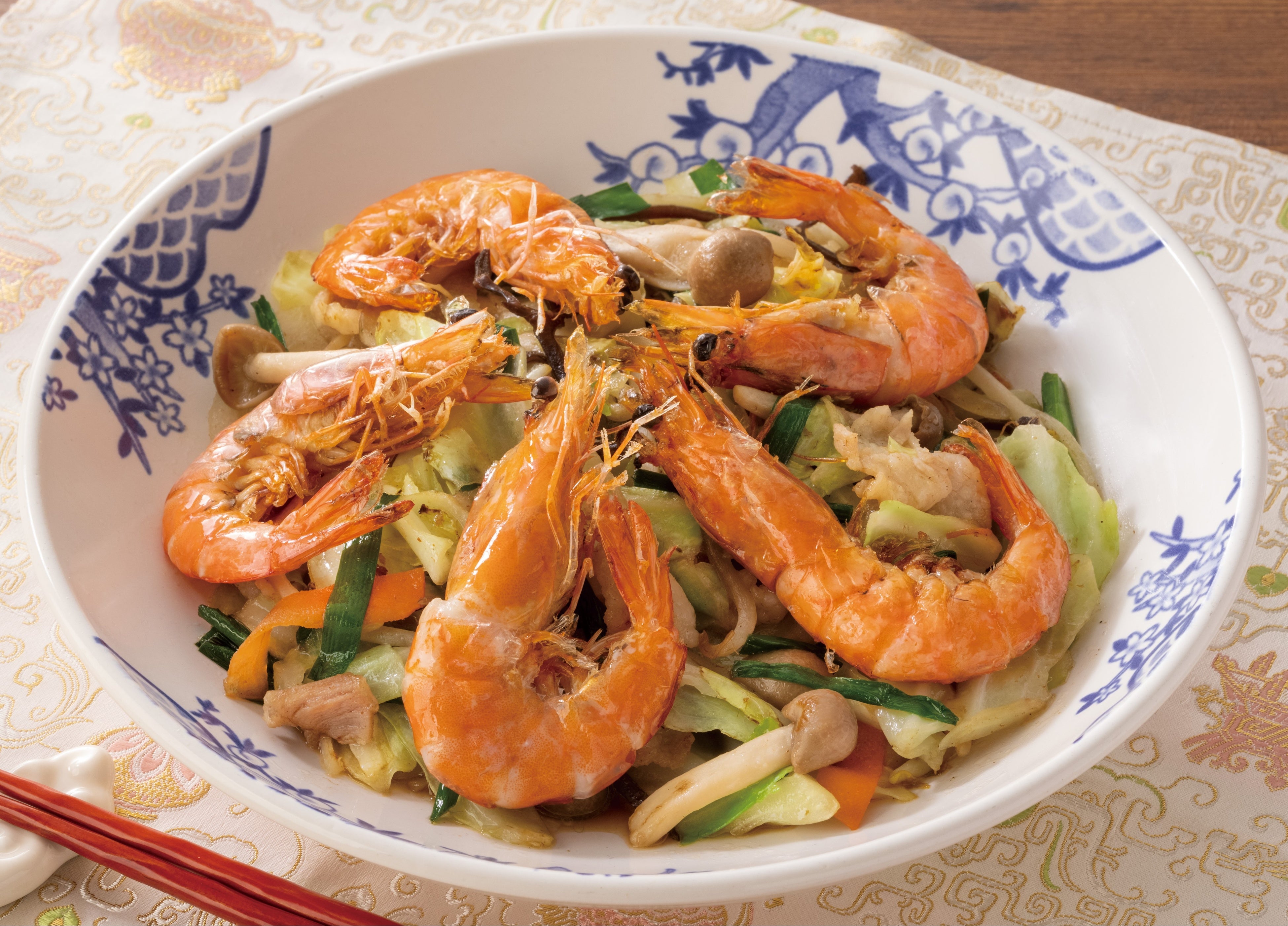 海老の香りのする沙茶醤(サーチャージャン)で、殻ごとお召し上がりいただける“ソフトシェルシュリンプ”5尾を炒めたボリューム満点の野菜炒めです。