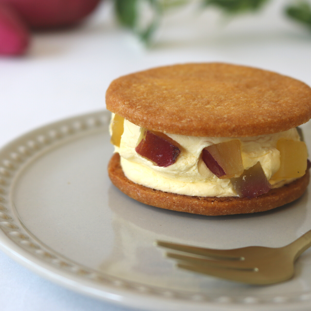 サクサクなクッキーに濃厚なさつまいものバタークリームをたっぷりとサンド。 お芋のダイスも入っており食感楽しい、をかしなバターサンドです。