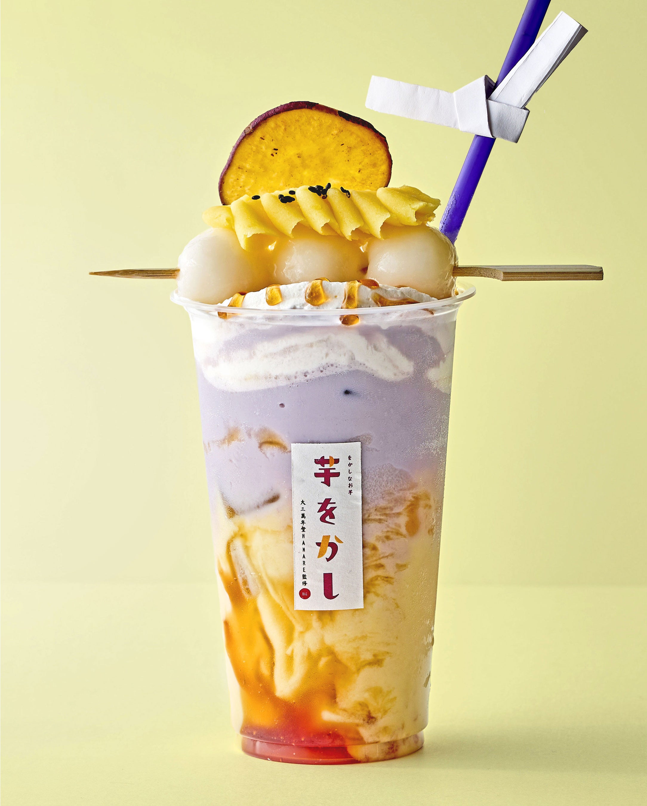 「黄芋」と「紫芋」の2層がまるで夕日のように綺麗(をかし)で、芋と豆乳を合わせたまろやかな口当たり。ホイップクリームやみたらしソースとの相性も抜群です。