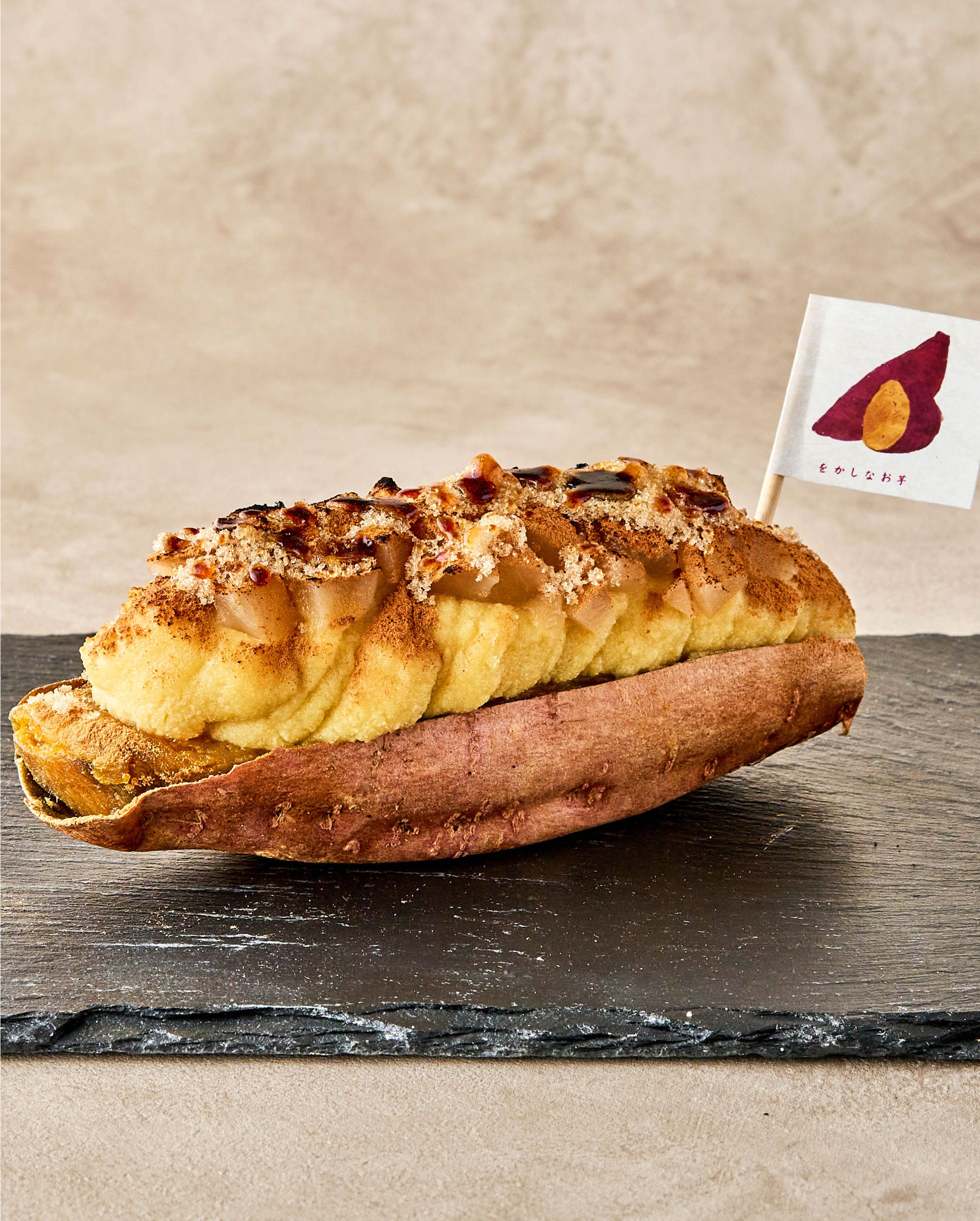 焼き芋に、芋キャラメルクリームを “ぷっくり” と可愛らしく “をかし” に乗せ、さらに ごろごろ林檎をたっぷりと。