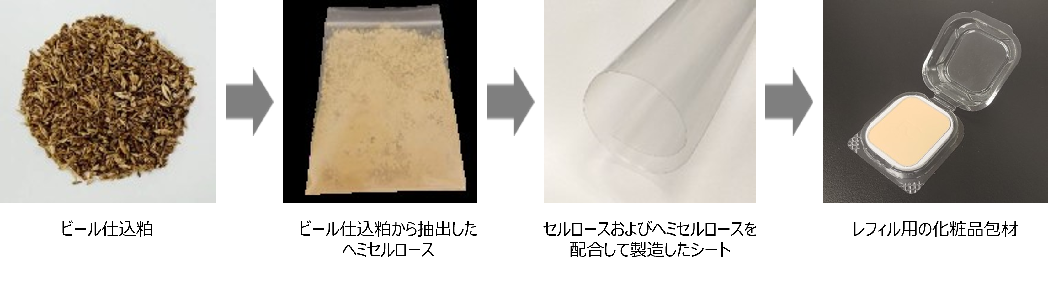このシートを用いて、無色透明な包材に成形することは技術的なハードルが高いものの、各社の知見を活用し、国内で初めて、ビール仕込粕から植物由来のレフィル用化粧品包材の製品化に成功しました(図1)。