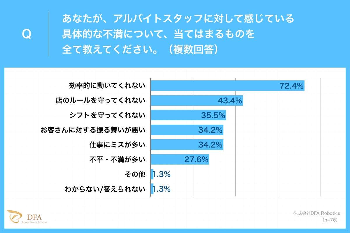 具体的な理由として、「効率的に動いてくれない」72.4%、「店のルールを守ってくれない」43.4%などの意見が多く、アルバイトスタッフに対する悩みがあることも分かりました。
