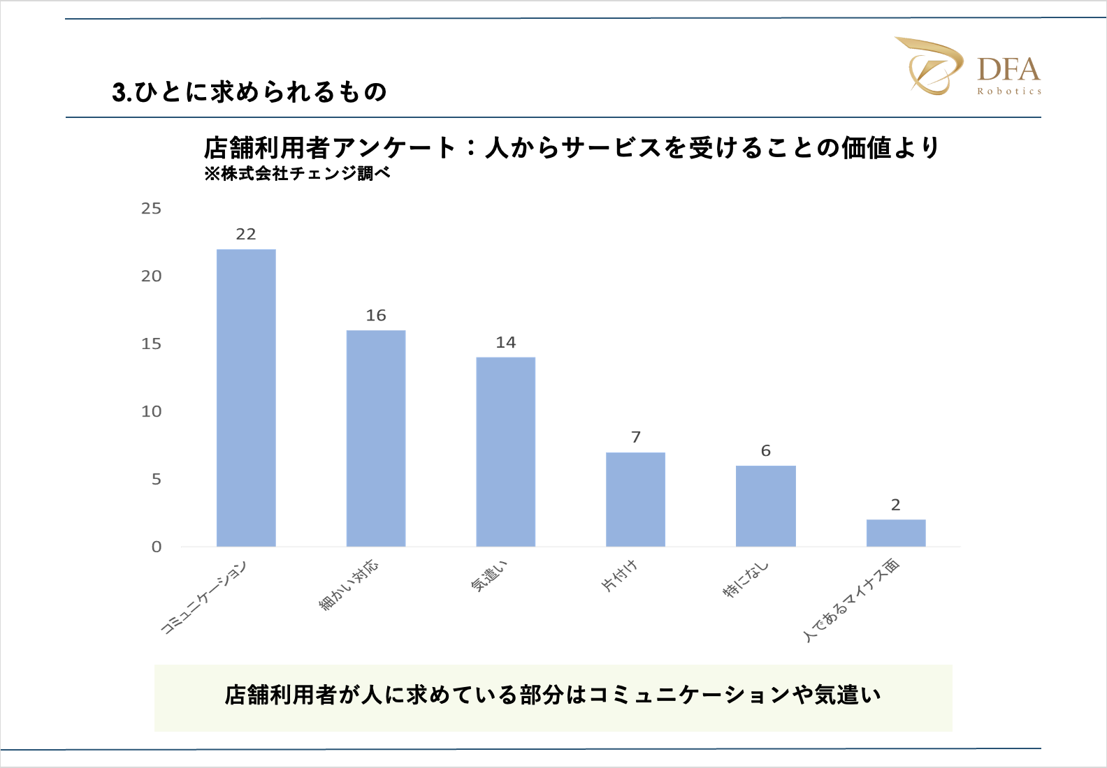ロボットが配膳を行い、機械で会計をするロボットサービスを導入した際、お客様が飲食店で人に求めるサービスとはどこにあるのでしょうか。ファミリーレストランに訪れたお客様に行ったアンケートによると「人から何の価値を受け取りたいか」という問いに対して、「コミュニケーション」や「細かい対応」という結果が得られました。