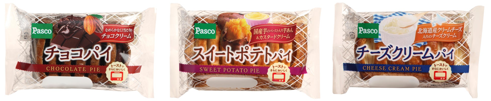 また、「アップルパイ」のリニューアルに合わせ、「チョコパイ」、「スイートポテトパイ」、「チーズクリームパイ」(商品により発売エリアが異なります)も同様に生地配合の見直しを行い、歯切れのよい食感へとリニューアルします。