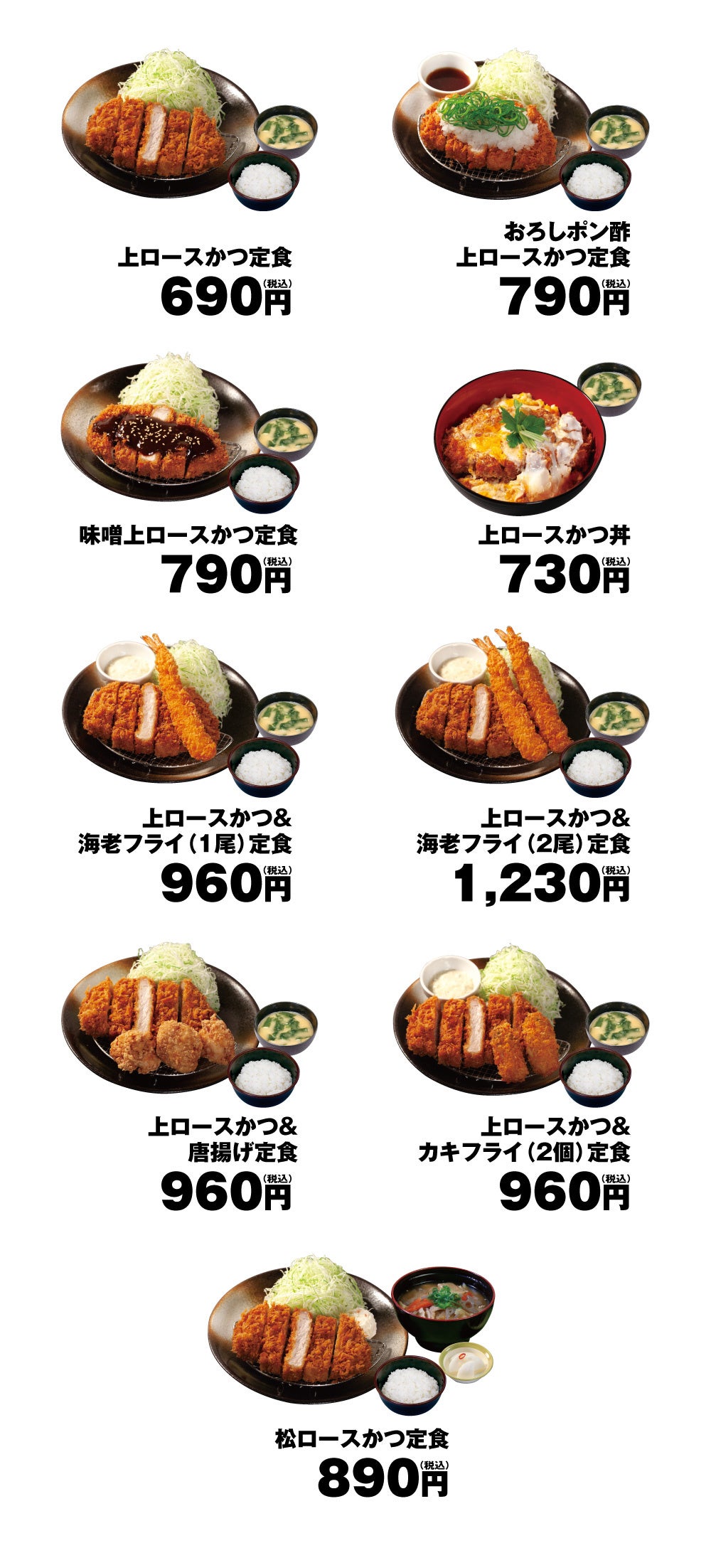 | 商品名 上ロースかつ定食 690円 おろしポン酢上ロースかつ定食 790円 味噌上ロースかつ定食 790円 上ロースかつ丼 730円 上ロースかつ&海老フライ(1尾/2尾)定食 960円/1,230円 上ロースかつ&唐揚げ定食 960円 上ロースかつ&カキフライ(2個)定食 960円 上ロースかつ単品 450円 松ロースかつ定食(上ロースかつ+豚汁+お新香) 890円 ※全て税込価格です。また、店内・お持ち帰りの税込価格は同一です。 ※お持ち帰りいただけます。お持ち帰りのみそ汁は、別途60円でお買い求めいただけます。 発売日 2022年12月21日(水)午後3時 |