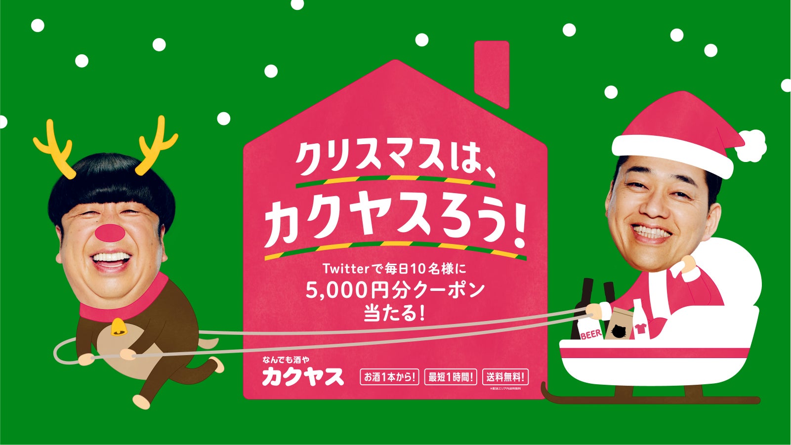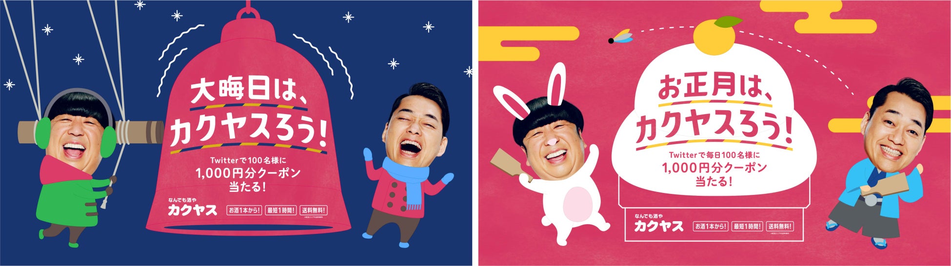 株式会社カクヤス(東京都北区、代表取締役社長:佐藤順一、以下:当社)は、「1本からピンポーン!」のバナナマンさんのCMでおなじみ「なんでも酒やカクヤス」にて、何かと忙しい年末年始にカクヤスデリバリーを利用し豊かな時間を過ごしていただきたいという想いから、12月17日よりバナナマンの『年末年始はカクヤスろう!キャンペーン』を開催します。期間中は合計490名様にその場でクーポンが当たるTwitterキャンペーンを実施、さらに12月19日から25日まで東京メトロ、JR東日本、大阪梅田駅に交通広告も掲出いたします。
