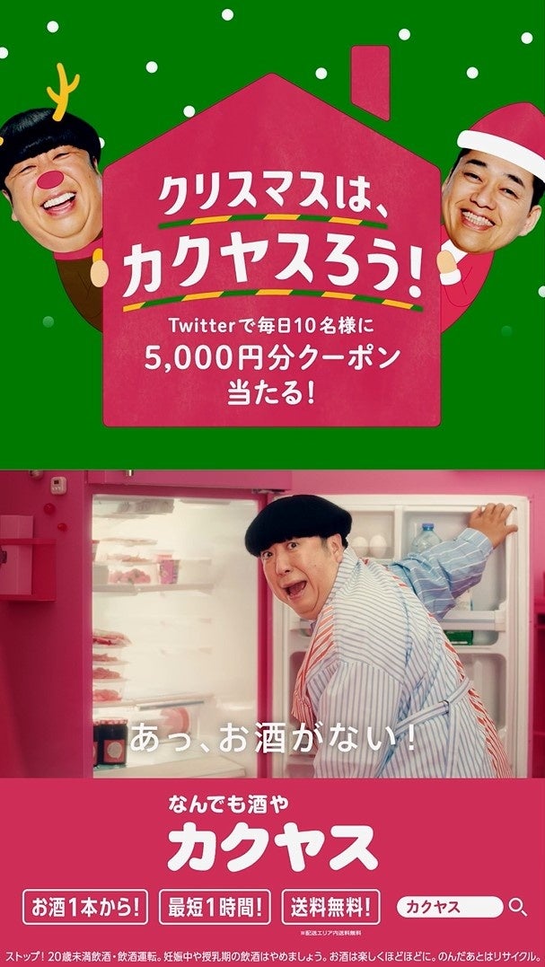 株式会社カクヤス(東京都北区、代表取締役社長:佐藤順一、以下:当社)は、「1本からピンポーン!」のバナナマンさんのCMでおなじみ「なんでも酒やカクヤス」にて、何かと忙しい年末年始にカクヤスデリバリーを利用し豊かな時間を過ごしていただきたいという想いから、12月17日よりバナナマンの『年末年始はカクヤスろう!キャンペーン』を開催します。期間中は合計490名様にその場でクーポンが当たるTwitterキャンペーンを実施、さらに12月19日から25日まで東京メトロ、JR東日本、大阪梅田駅に交通広告も掲出いたします。