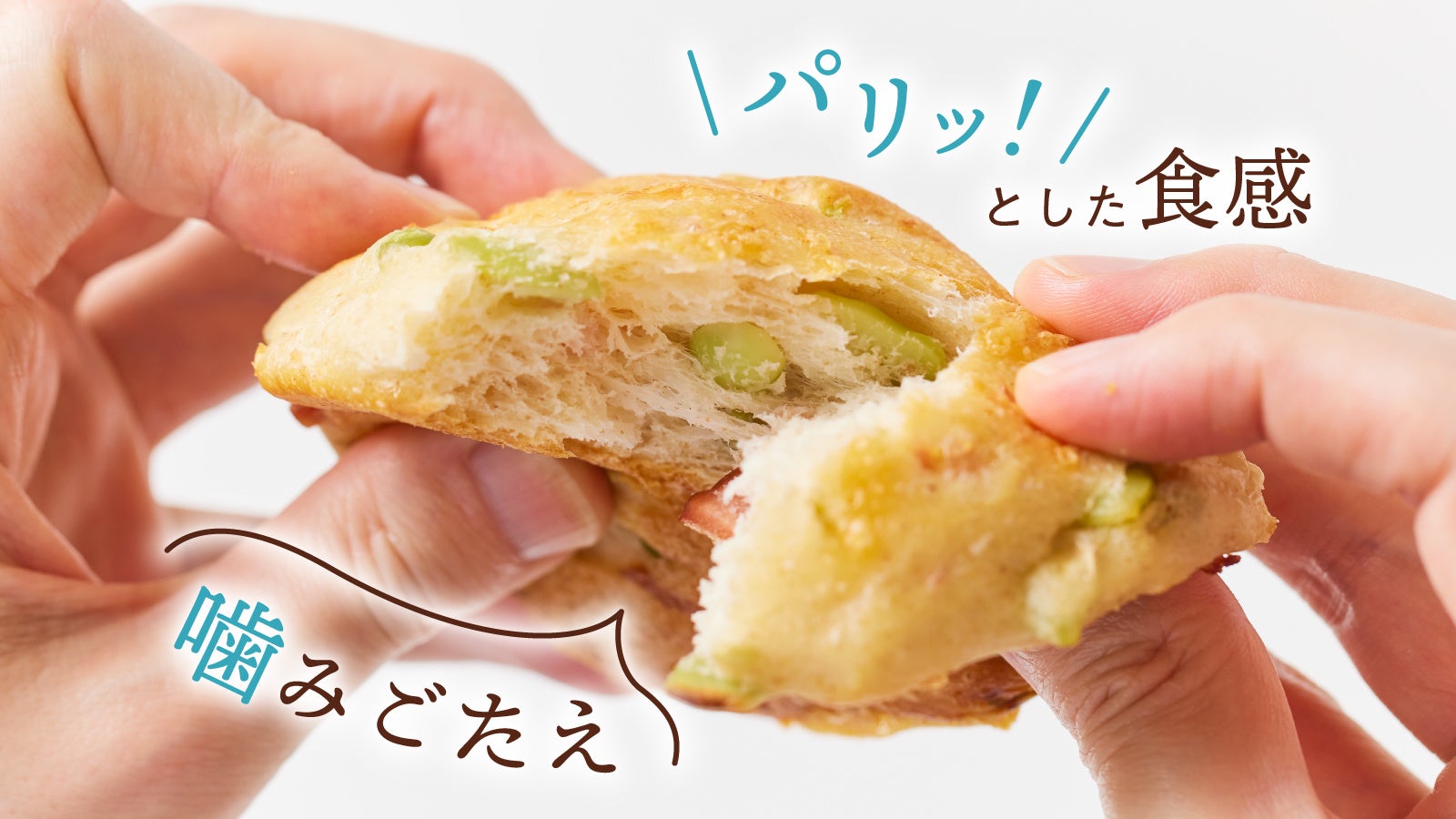 枝豆、ベーコン、チーズを加えたパンにグリエールチーズをトッピングした惣菜パン。