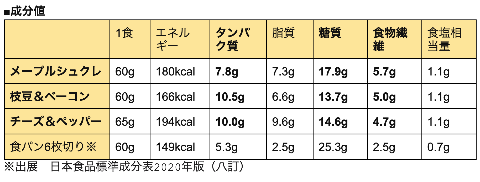原材料:小麦粉(小麦(長野県産))、ミックス粉(植物性たん白、澱粉、ぶどう糖、食塩、植物 油脂、パン酵母)、バター、エリスリトール、小麦全粒粉、鶏卵、マーガリン、メープ ルシロップ加工品、パン酵母、食塩/着色料(カラメル)、香料、加工澱粉、増粘多糖 類、pH調整剤、乳化剤、甘味料(スクラロース、ラカンカ抽出物)、(一部に小麦・乳 成分・卵・大豆を含む)