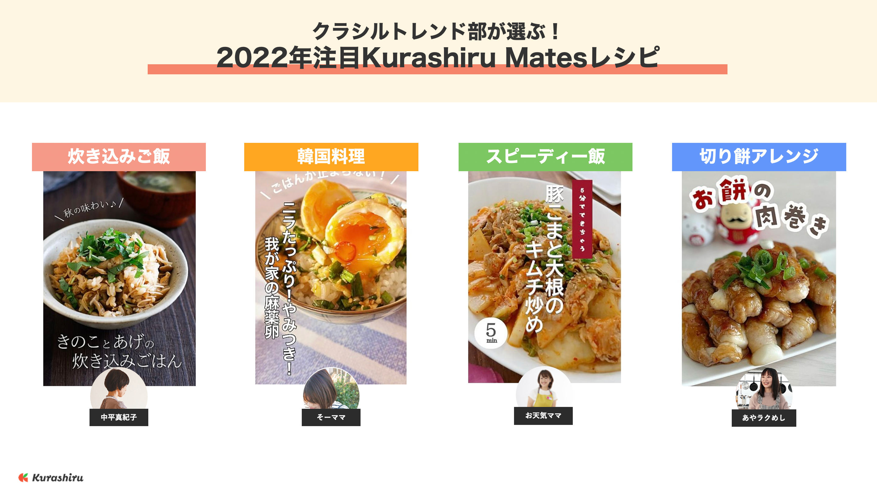 2022年に「クラシル」内での検索が増加し、「Kurashiru Mates」(「クラシル」にレシピを投稿するクリエイター)からも注目を集めたレシピをご紹介いたします。