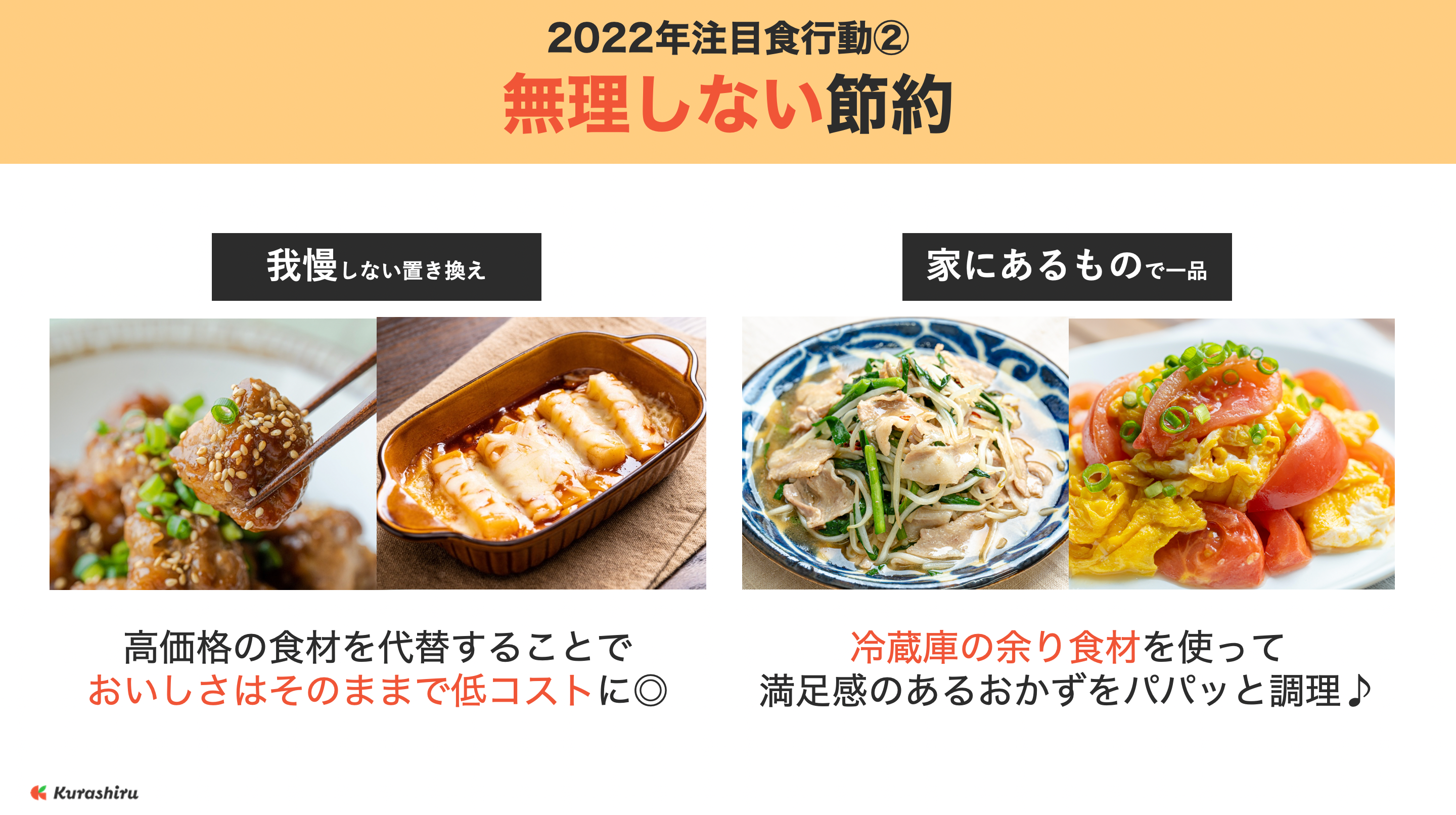 食品の値上げが相次ぐ中でも、”無理しない節約”レシピで毎日の食事を考える傾向にありました。我慢しない置き換えや家にあるものを活用したレシピを再生数とあわせてご紹介いたします。