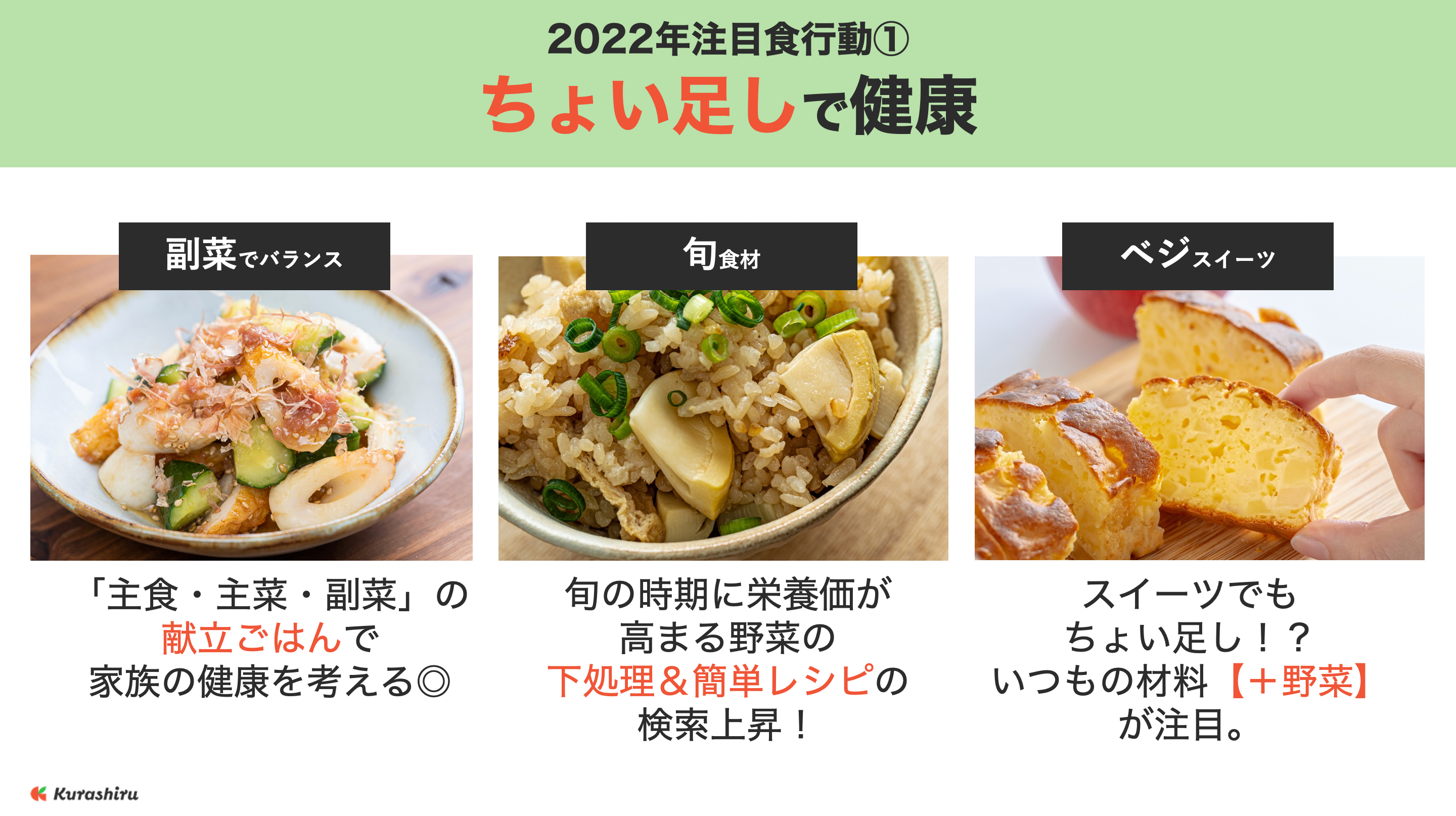 コロナ禍の2020年以降、体型維持や予防の観点から「健康」を意識するユーザーが増加。2022年は健康的で完璧な食事を目指すのではなく、”ちょい足し”で飽きずに健康的な食事を継続する傾向にありました。その中から3つのキーワードをご紹介いたします。
