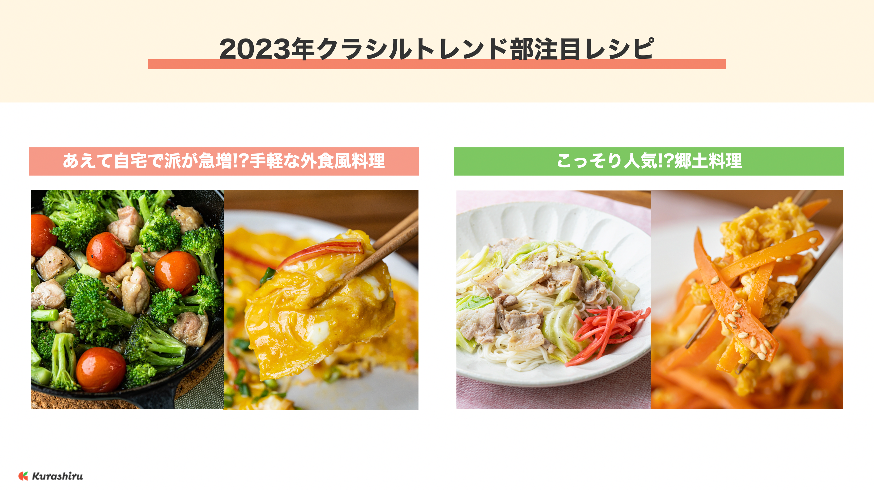 居酒屋や中華料理屋で定番の「かに玉」など手軽な外食風料理や、帰省や旅行で出会った郷土料理の検索数が徐々に増えており、2023年のトレンドになると予測しています。