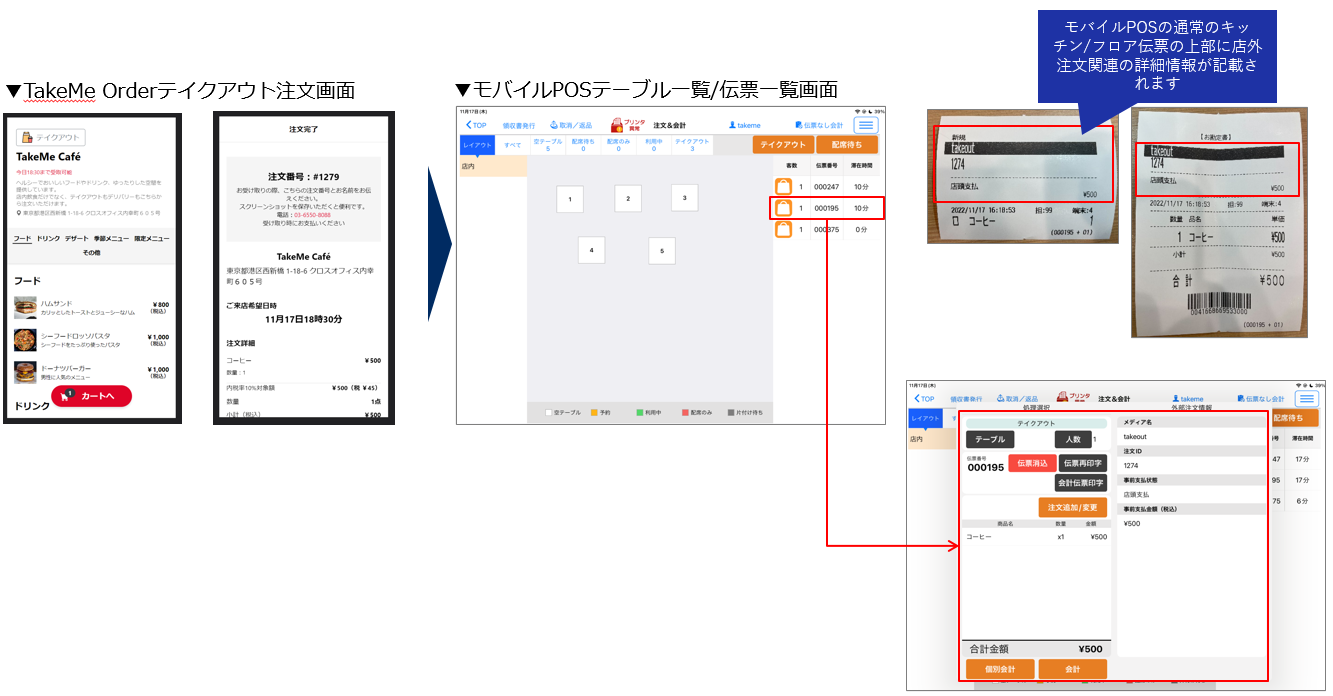 モバイルPOSの伝票一覧画面にてテイクアウト注文として自動登録され、キッチン伝票、フロア伝票が印字されます。(伝票上部に「takeout」と表記され、TakeMe Order側の注文番号が併せて印字されます)
