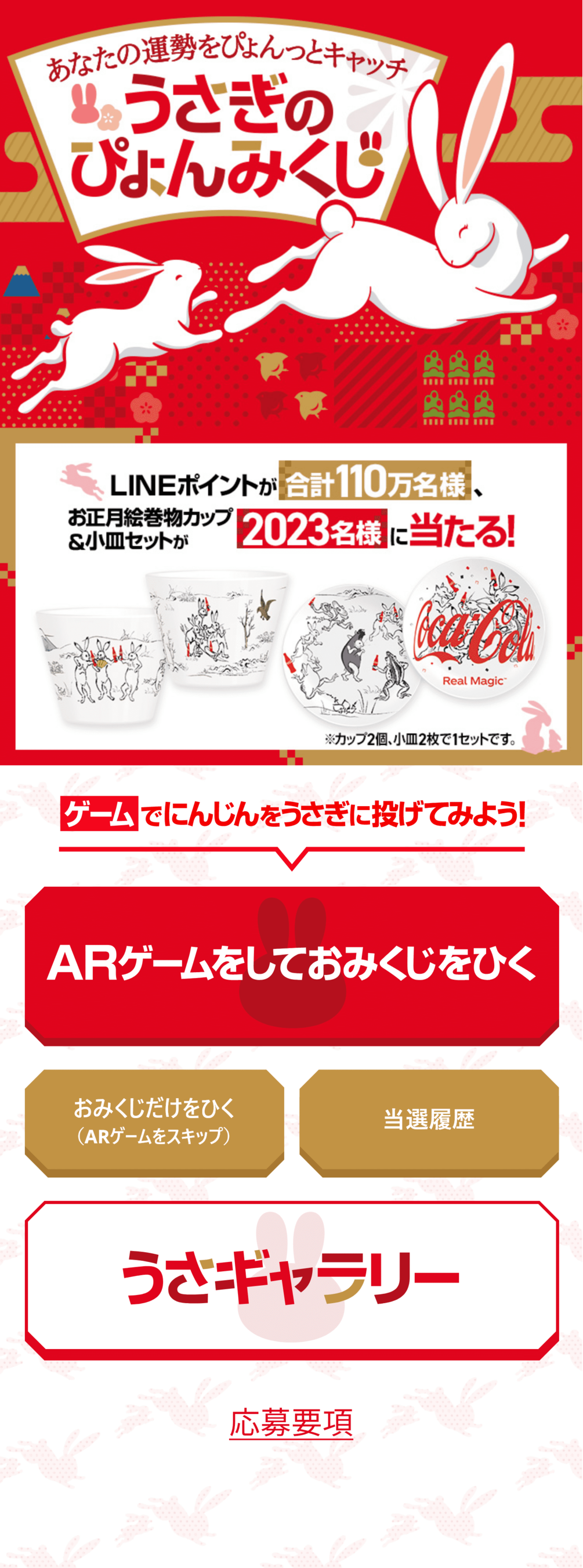 「コカ・コーラ うさぎボトル」のラベル裏にある二次元コードをスマートフォンで読み込みSNSのログイン画面でログインするとうさぎがスマートフォンの画面上に登場します。スマホ上でにんじんを投げると、うさぎが9つのテーマ(今日・仕事・健康・推し・勉強・恋愛・新年・新成人・節分)の中から1つ選び、その結果を教えてくれます。また、おみくじの結果に合わせて抽選で「コカ・コーラ」オリジナル“お正月絵巻物カップ&小皿セット”やLINEポイントがその場で当たります。思わず“心もぴょんっ”となってしまうおみくじ体験を、是非お楽しみください。