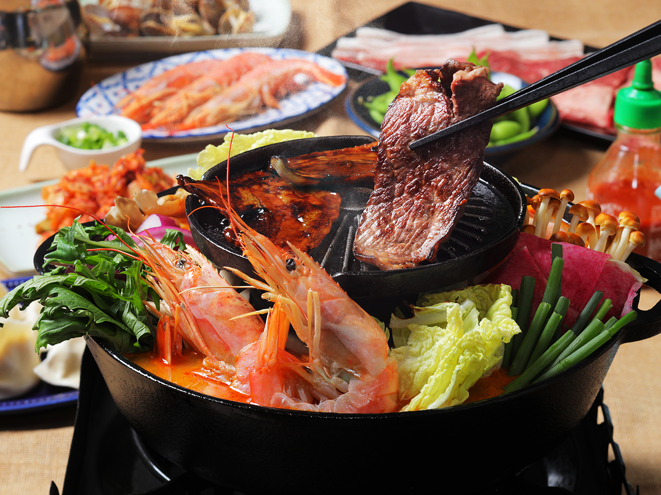 ムーガタは上段で焼肉を、下段で鍋が味わえるタイ発祥の2段式鍋。「チャトニー」「A&P」では、タイのトムヤムクンのほか、ベトナムのレモングラス・チキン、台湾の薬膳豆乳、韓国のキムチチゲのアジア各国の定番スープを楽しめる”ムーガタ”鍋を堪能いただけます。