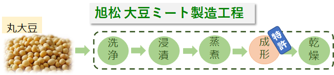 ▶⼀般的な⼤⾖ミートは、丸⼤⾖に含まれる油により製造が困難になるため、脱脂⼤⾖を原料に製造しますが、当社は独⾃新製法により、丸⼤⾖から⼤⾖ミートを安定製造します。