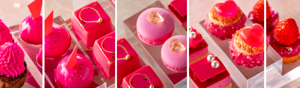 エグゼクティブペストリーシェフ 諸戸清貴によってクリエイトされたスイーツは、サプライズを秘めた味わいを。ストロベリーチョコレートのなめらかなクリームにむっちりとしたマシュマロを絞ったタルト、レモングラスとストロベリーソースが甘酸っぱく爽やかなスウィリ、アニスとエルダーフラワーのスパイス&ハーブが軽やかな口当たりのムースキューブなど、どれを食べても異なるフレーバーが隠れています。トップにはパールやダイヤを模ったトッピングが施され、ジュエリーボックスを開けたときのようなキュン♡な装いに。