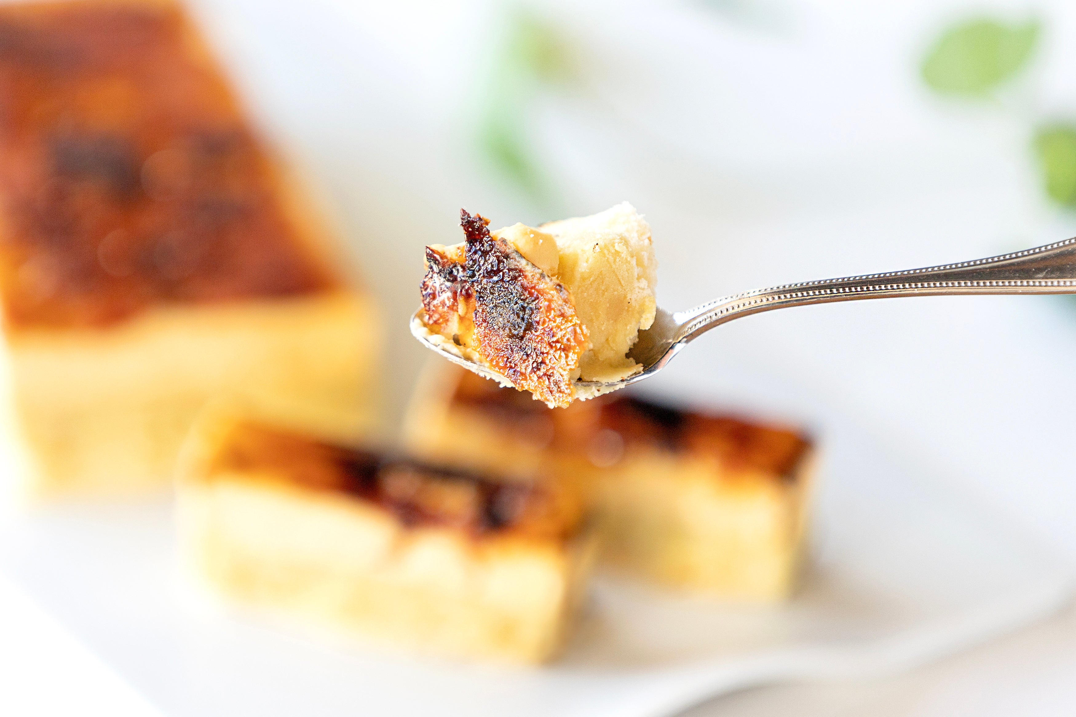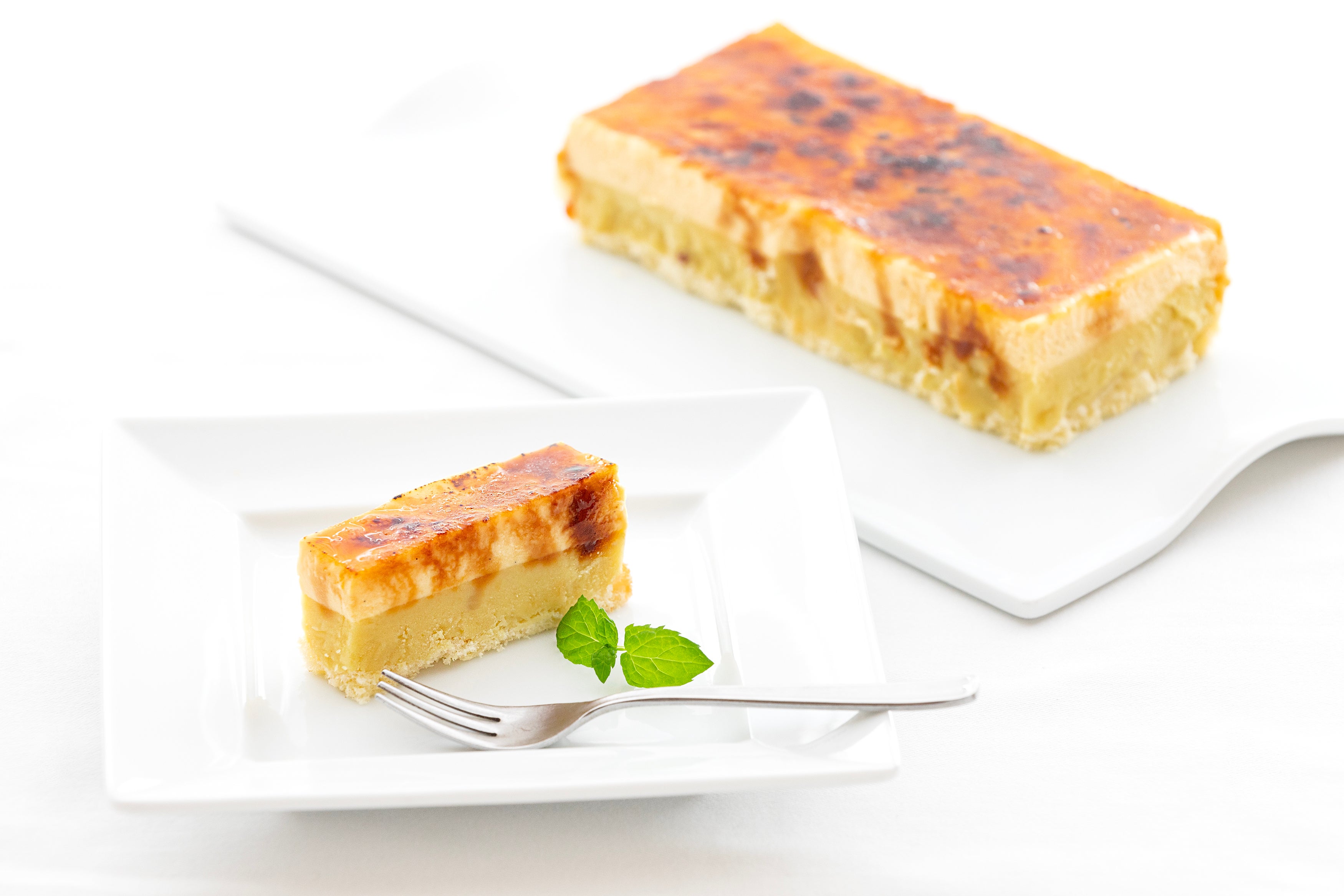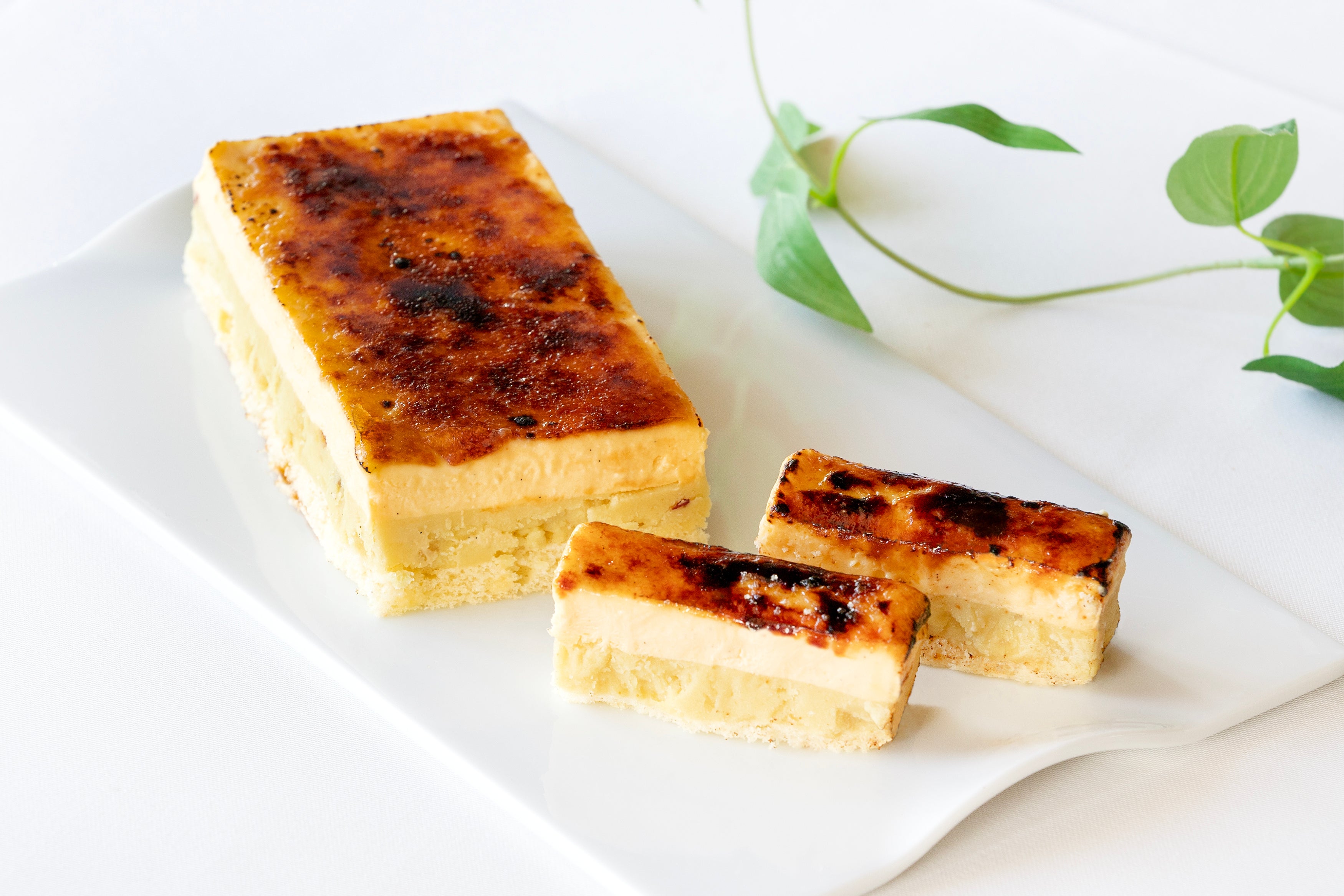 新鮮な静岡県産の鶏卵を使用。卵黄のみを贅沢に使用し、生クリームと合わせ濃厚な味に仕上げました。上のカラメル部分にはさつまいも羊羹の部分で使用するカソナードを使用し、パリッとした食感と甘みの統一感を意識しました。