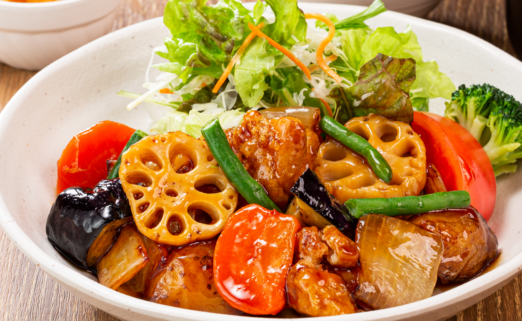 不動の人気NO.1メニュー!玄米黒酢と黒糖に、りんご酢で味を調えた、大戸屋オリジナルの黒酢あん。