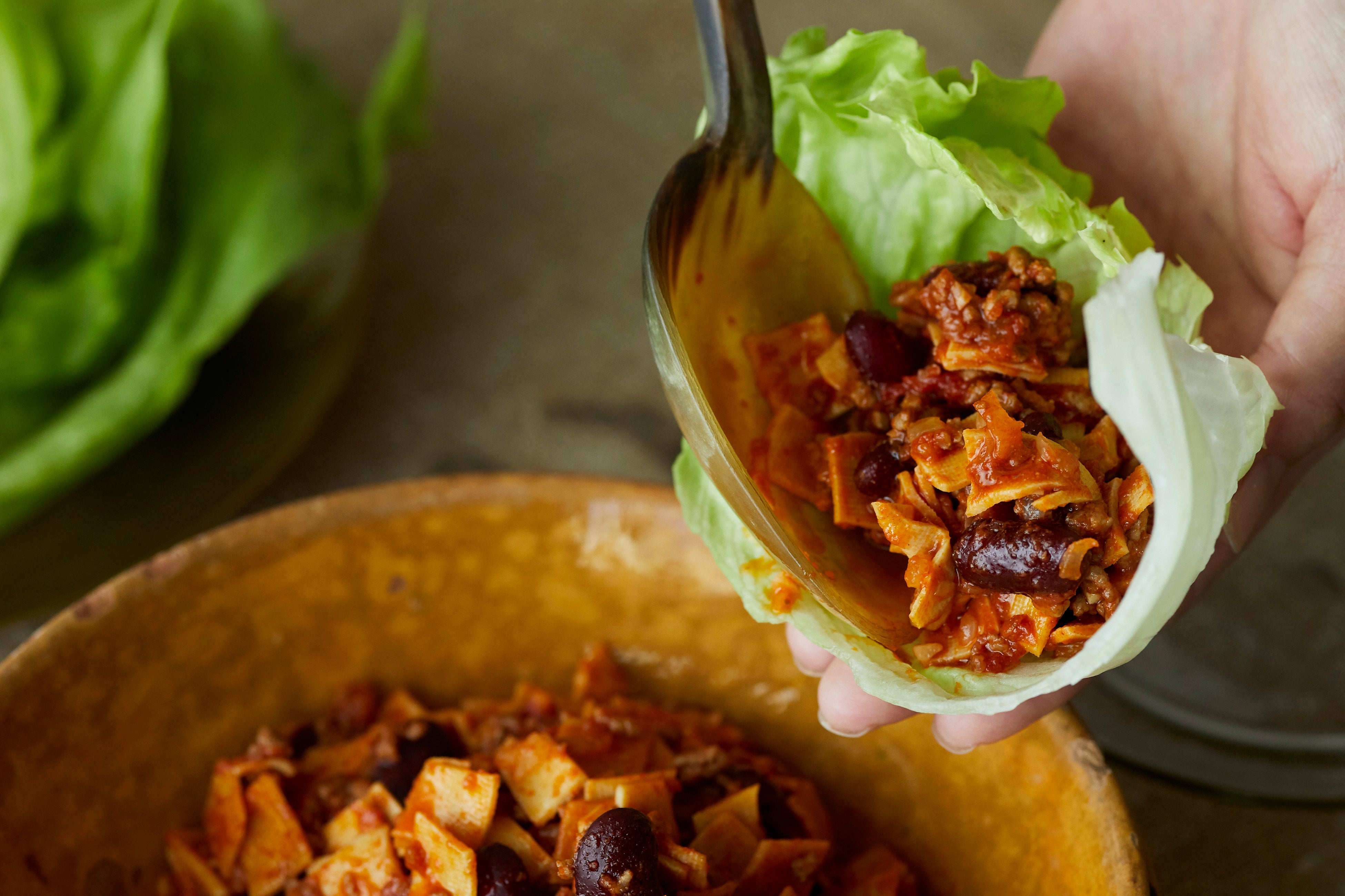 スパイスとの相性が抜群な豆腐干は、大人数でシェアしやすいメニューとして登場するチリビーンズにもアレンジできます。トルティーヤではなく、レタスで巻くことでカロリーダウン、罪悪感なくパーティーを楽しむことができます。