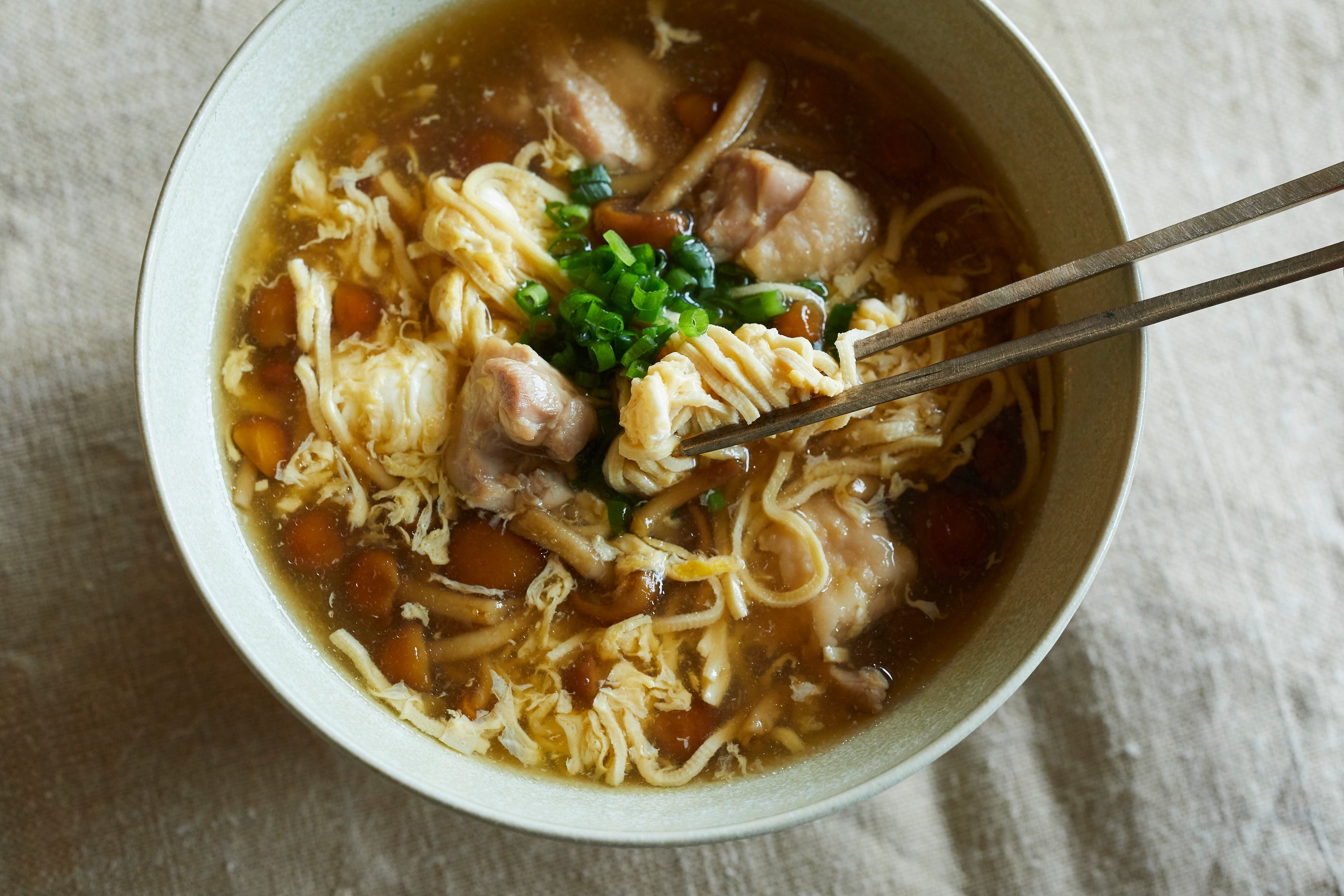 たんぱく質豊富な豆腐干と鶏肉と食物繊維たっぷりのなめこをかき玉風にアレンジ、身体を芯から温めてくれる一品です。年末年始の食べ過ぎで疲れた胃腸にも優しい味つけになっています。