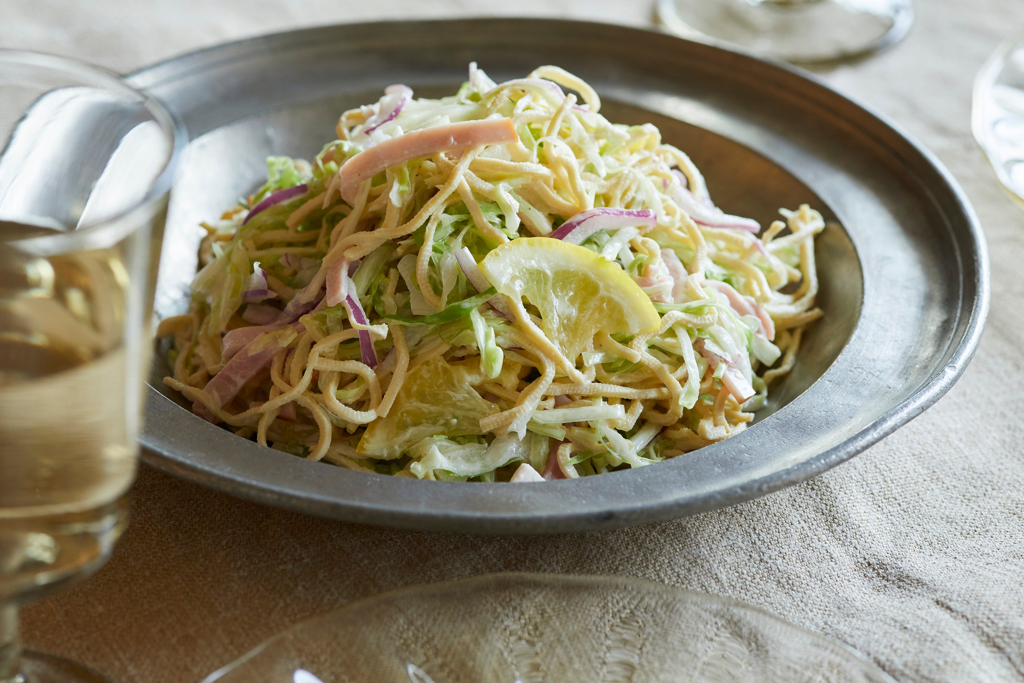 カットしたキャベツ、紫玉ねぎ、ロースハム、レモンと豆腐干を和えるだけの誰でもできるお手軽レシピです。野菜をたっぷり食べながら、たんぱく質も摂れる豆腐干サラダは栄養満点、パーティーの前菜にもおすすめです。