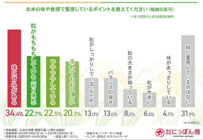 そこで、「お⽶の味や⾷感で重視しているポイントを教えてください(複数回答可)」と質問したところ、『味に⽢みがある(34.4%)』と回答した⽅が最も多く、次いで『特に重視している点はない(31.9%))』『粒がもちもちしてい る(粘り強め)(22.7%)』『つやつやしている(22.5%)』『冷めてもおいしい(20.3%)』と続きました。
