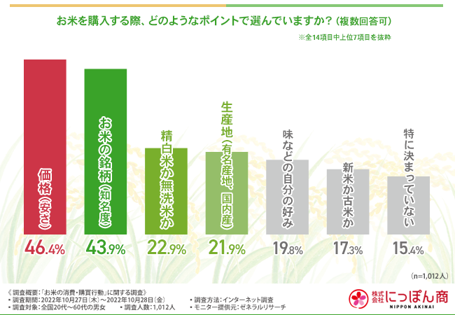 「価格(安さ)」もしくは「お⽶の銘柄(知名度)」で商品を選んでいる⽅が多いようです。