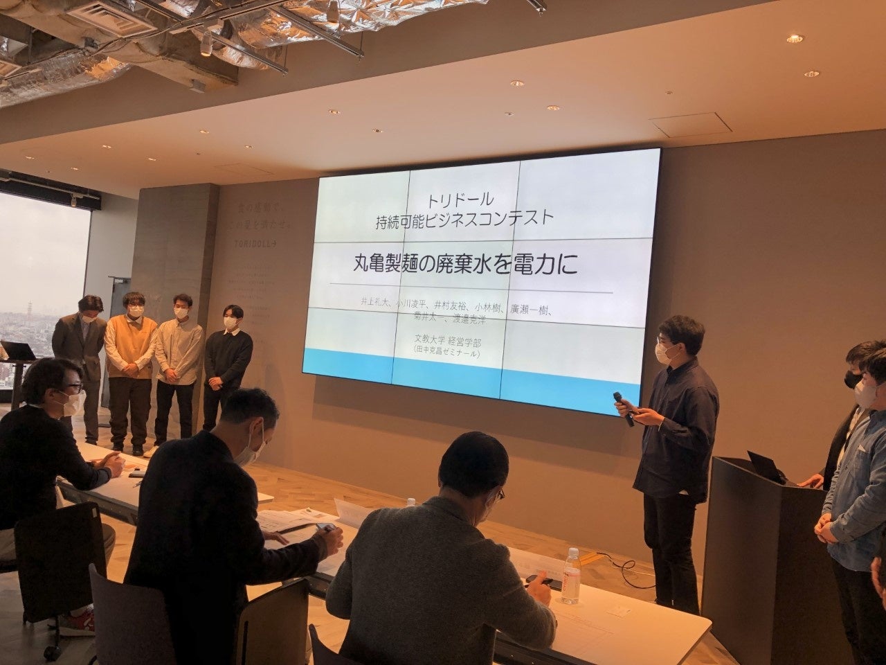 今回のコンテストの結果、文教大学 経営学部 田中克昌ゼミナールのチームが見事、最優秀賞を受賞されました。「丸亀製麺の廃棄水を電力に」というテーマでプレゼンテーションいただき、審査員からは企画のアイデアや説明の構成、実現性、効果算出などが高く評価されました。