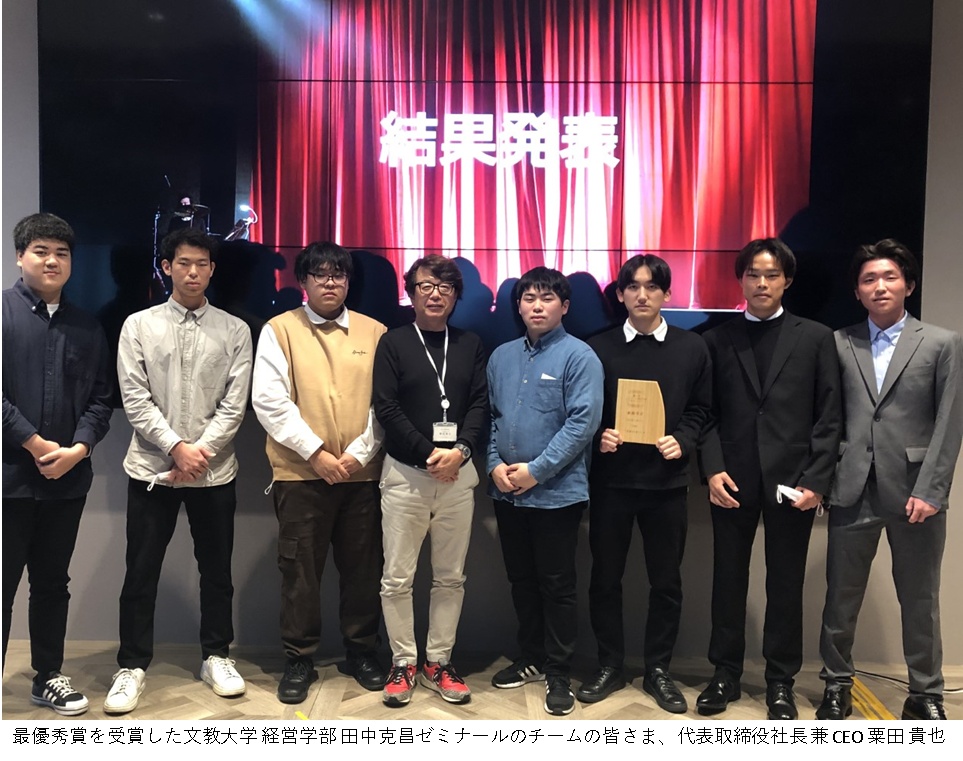 今回のコンテストの結果、文教大学 経営学部 田中克昌ゼミナールのチームが見事、最優秀賞を受賞されました。「丸亀製麺の廃棄水を電力に」というテーマでプレゼンテーションいただき、審査員からは企画のアイデアや説明の構成、実現性、効果算出などが高く評価されました。