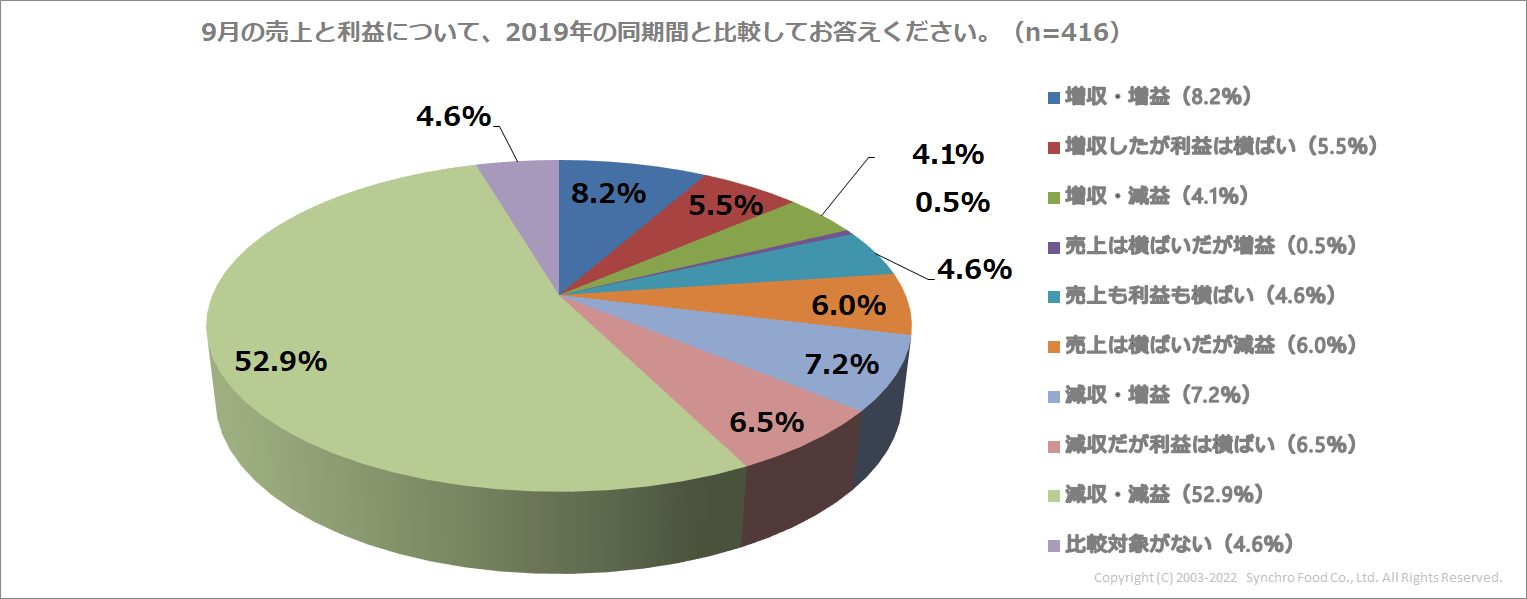 次に、2022年9月の売上と利益を2019年9月と比較してもらったところ、「増収・増益」との回答は、わずか8.2%にとどまりました。対して、「減収・減益」は52.9%。長引くコロナの影響に加え、食材価格の高騰などもあり、コロナ禍前の売上・利益に届かない店舗が大多数を占めています。