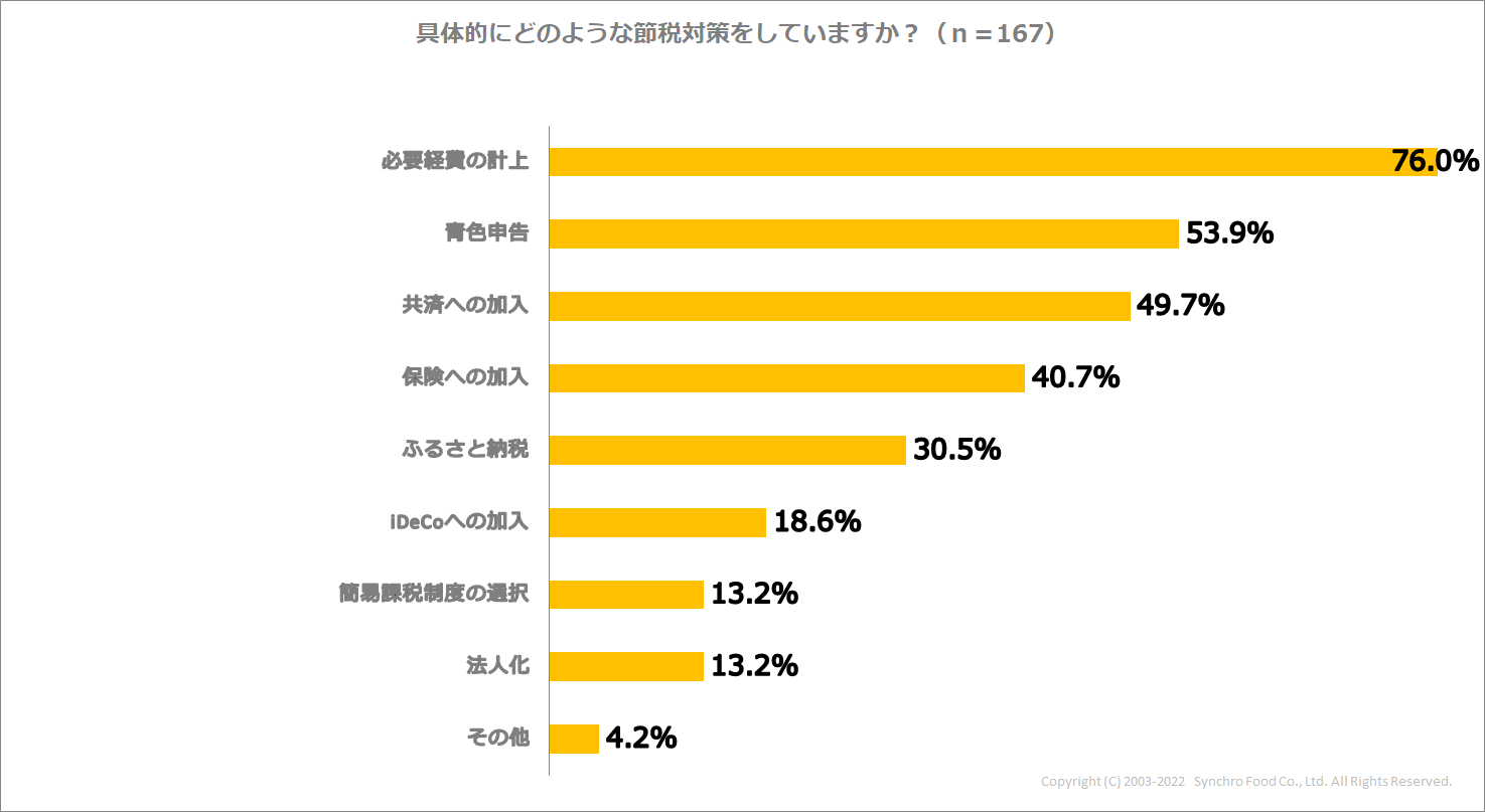 回答者の状況別では、「対策したいと思っているが、できていない」と回答した人のうち47.6%が「必要経費の計上」と回答。これから節税を始めたい人にとって、注目度の高い対策であることがわかります。一方で「対策をしている」と回答した人が最も多く選んだのは、「特になし(31.7%)」との回答。すでに節税対策を行っている飲食店は、現在実施している対策だけで十分だと考える店舗が多いようです。