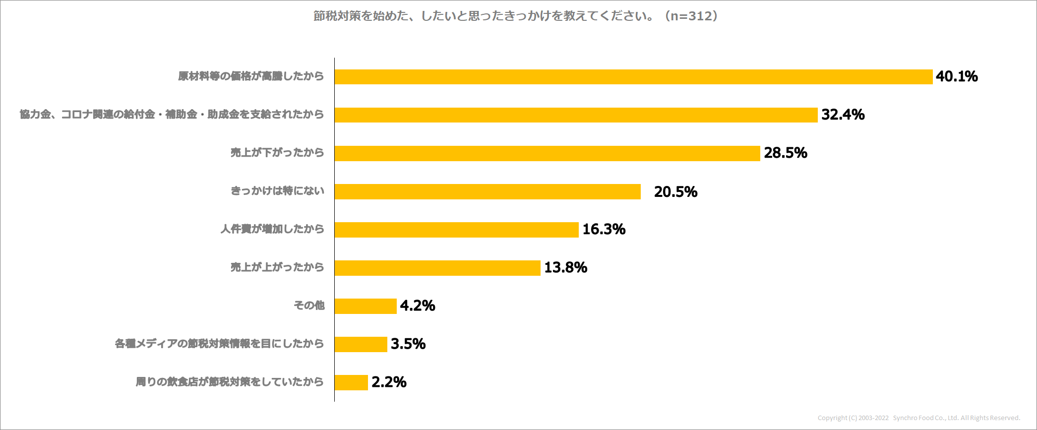 また、節税について「対策をしている」、「対策したいと思っているが、できていない」と回答した方に、節税対策を始めた、したいと思ったきっかけを尋ねました。最多は「原材料等の価格が高騰したから」の40.1%。これに「協力金、コロナ関連の給付金・補助金・助成金を支給されたから(32.4%)」、「売上が下がったから(28.5%)」が続きます。