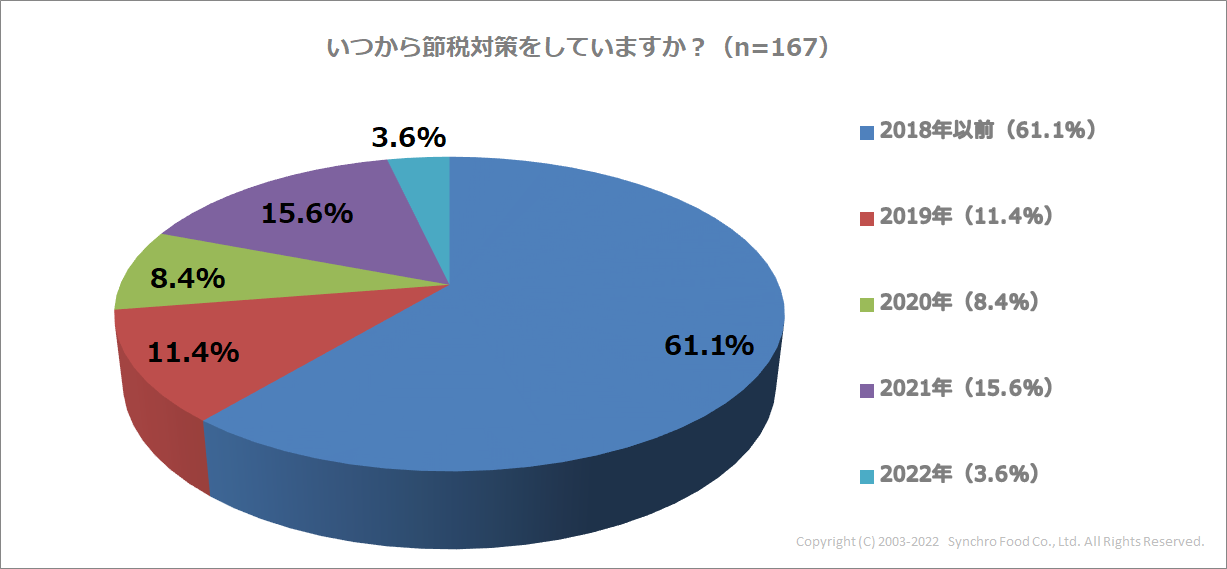 さらに、節税について「対策をしている」と回答した方に、いつから節税対策を始めたのか尋ねたところ、「2018年以前」が61.1%で最多となりました。対して、全体の27.6%は「2020年以降」と回答しており、コロナ禍以降に節税対策を始めた飲食店も一定数見られました。