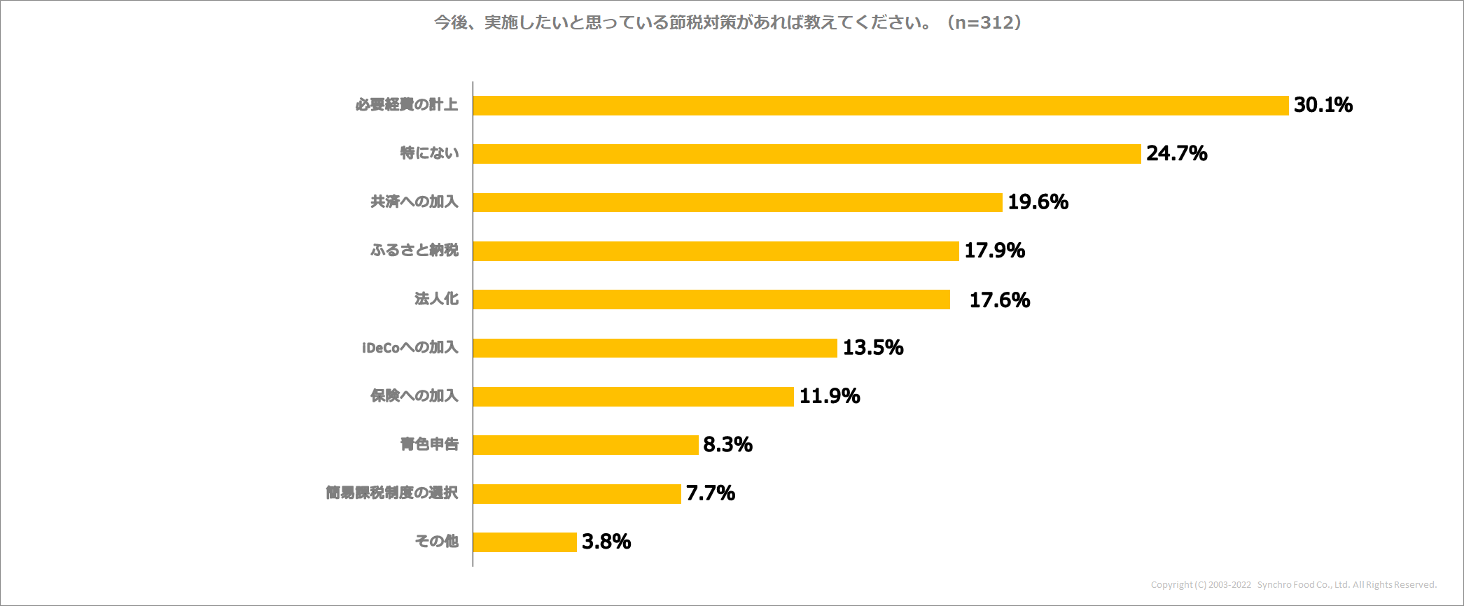 続いて、節税について「対策をしている」、「対策したいと思っているが、できていない」と回答した方に、今後、実施したいと思っている節税対策を尋ねたところ、「必要経費の計上(30.1%)」との回答が、最も多くなりました。