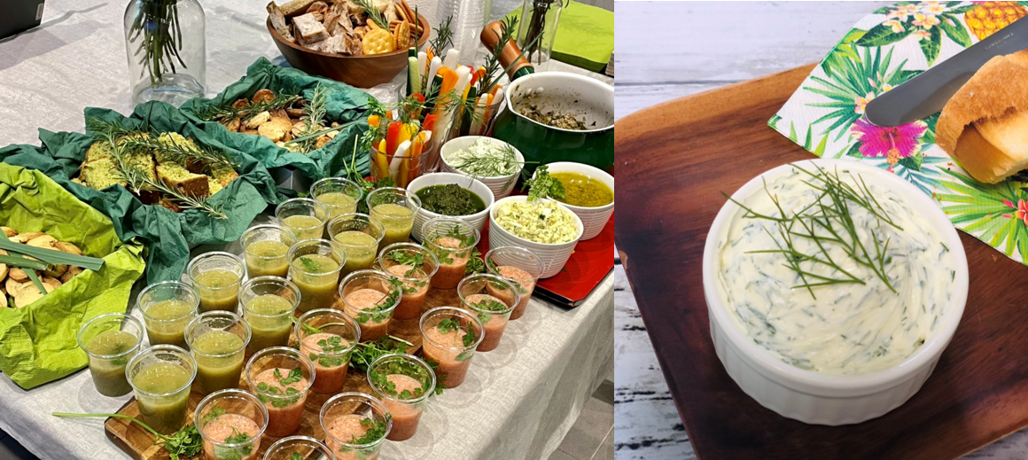 (5種のハーブディップソース、ローズマリーと抹茶のパウンドケーキや、パクチーとレモンのデトックスウォーター等)