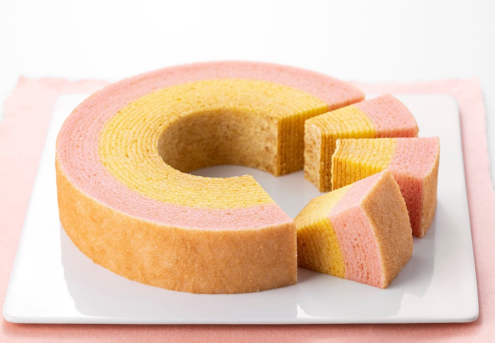 内側は、カステラのようにふっくらと焼きあげた定番のたまご風味のバームクーヘン。外側は、桜葉香るシロップをとけこませた桜色のバームクーヘン。2つの味わいが1度に楽しめるのは今だけ!縁起が良い“ねんりん家”の、さらに円(縁)が重なっておめでたいバームクーヘンです。