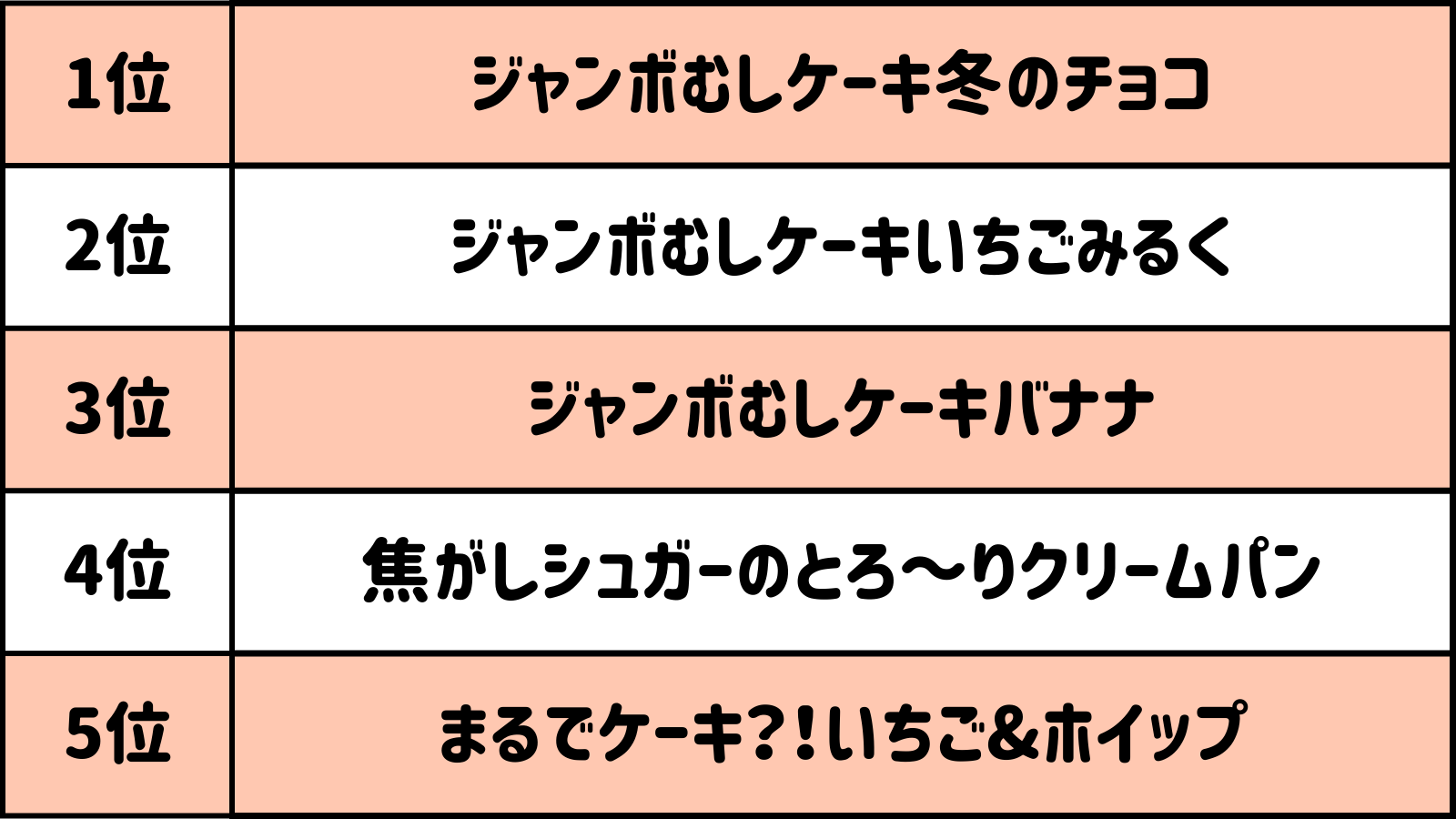 4~5位は新登場の“至福のひとときシリーズ“「焦がしシュガーのとろ~りクリームパン」「まるでケーキ⁈いちご&ホイップ」がランクインしました。
