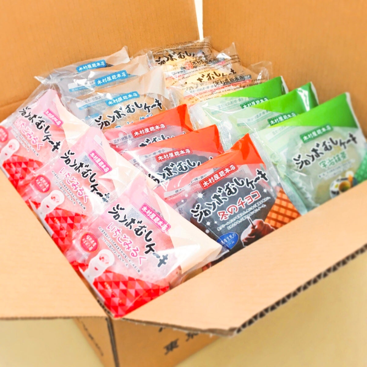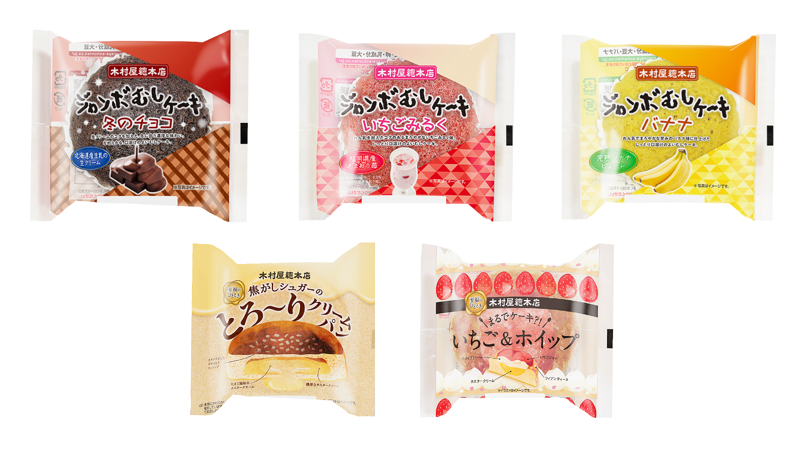 ジャンボむしケーキ「プレーン」 「宇治抹茶」「コーヒー牛乳」「冬のチョコ」「いちごみるく」の5種類×各3個のセットです。