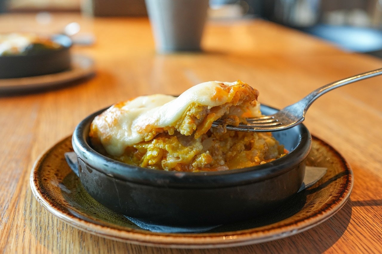 水牛モッツァレラチーズを堪能できる季節のラザニア。水牛モッツァレラチーズの風味を活かすため、ニンニクや玉ねぎは不使用。岩手県の有機かぼちゃ「南部一郎」と鶏のボロネーゼビアンコに、クリーミーなベシャメルソース、さらに水牛モッツァレラチーズをたっぷり使用しています。