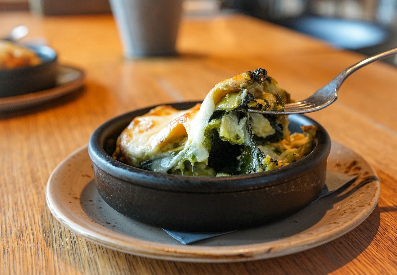 水牛モッツァレラチーズを堪能できるほうれん草のラザニア。水牛モッツァレラチーズの風味を活かすため、ニンニクや玉ねぎは使用していません。茨城県の契約農家より取り寄せた有機ほうれん草とベシャメルソース、水牛モッツァレラチーズを合わせました。