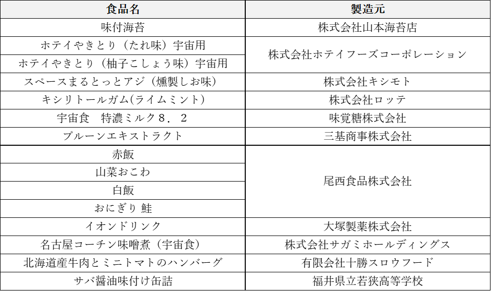 今回ISSに搭載された宇宙日本食は以下の11社/団体の15品目です。
