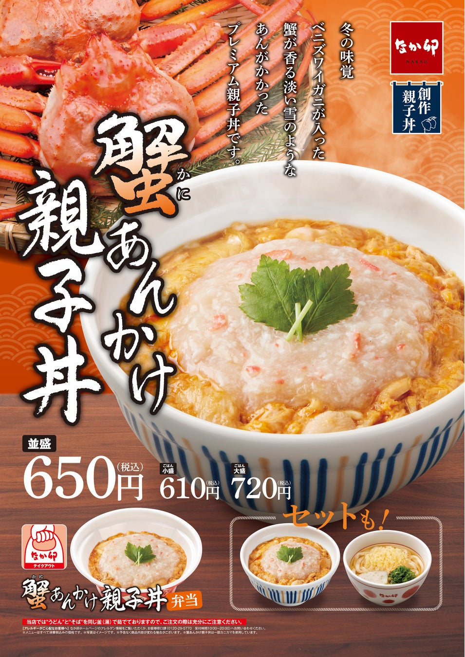 「なか卯」では、12月27日(火)AM11:00より「蟹(かに)あんかけ親子丼」を販売します。