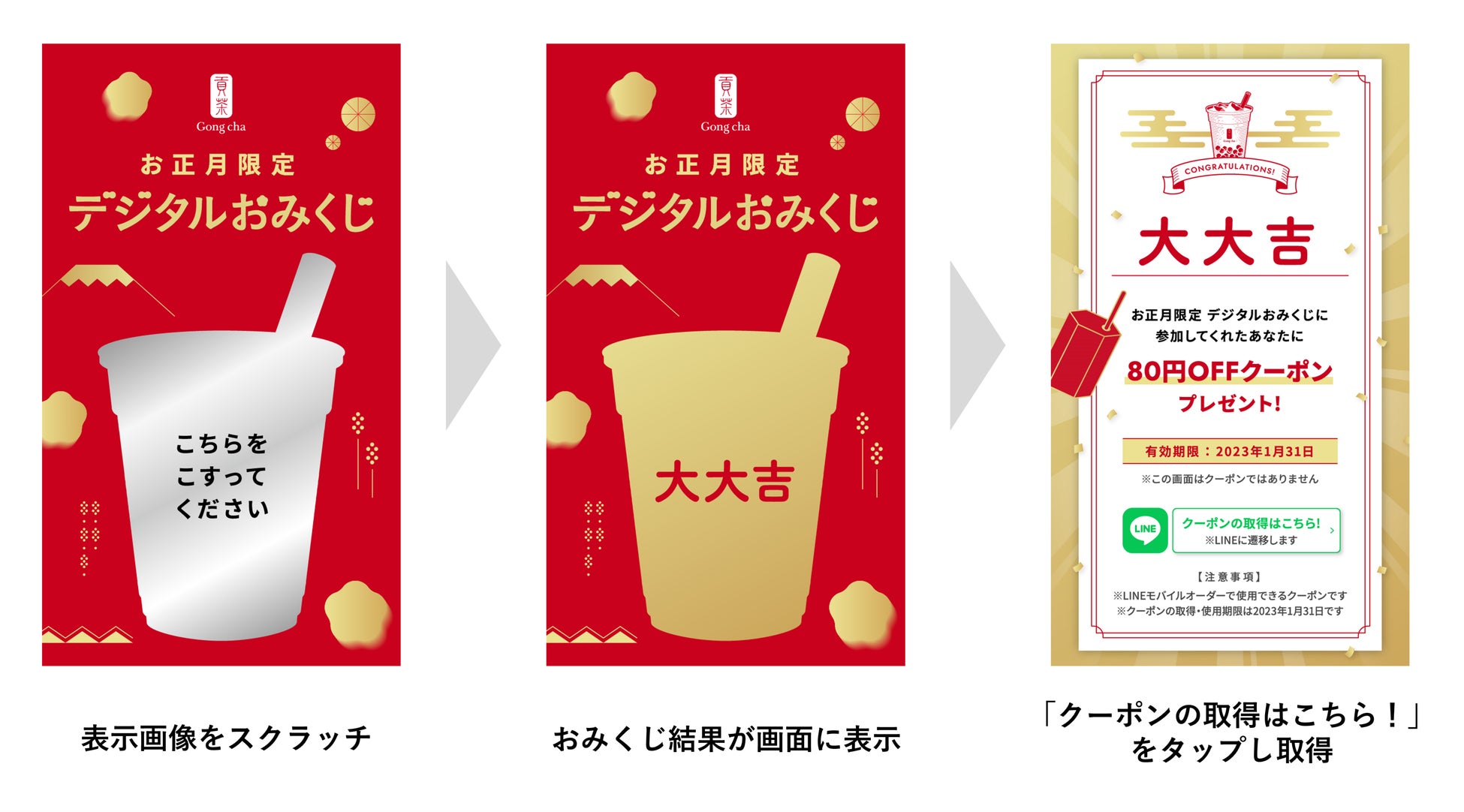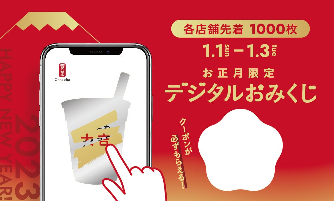株式会社ゴンチャ ジャパン(本社:東京都港区、代表取締役社長:角田淳、以下GCJ)は、旧年のご愛顧への感謝の気持ちと新しい年がお客様にとって HAPPY な一年となるよう願いを込めて、2023年1月、「デジタルおみくじ」プレゼントキャンペーンを開催いたします。